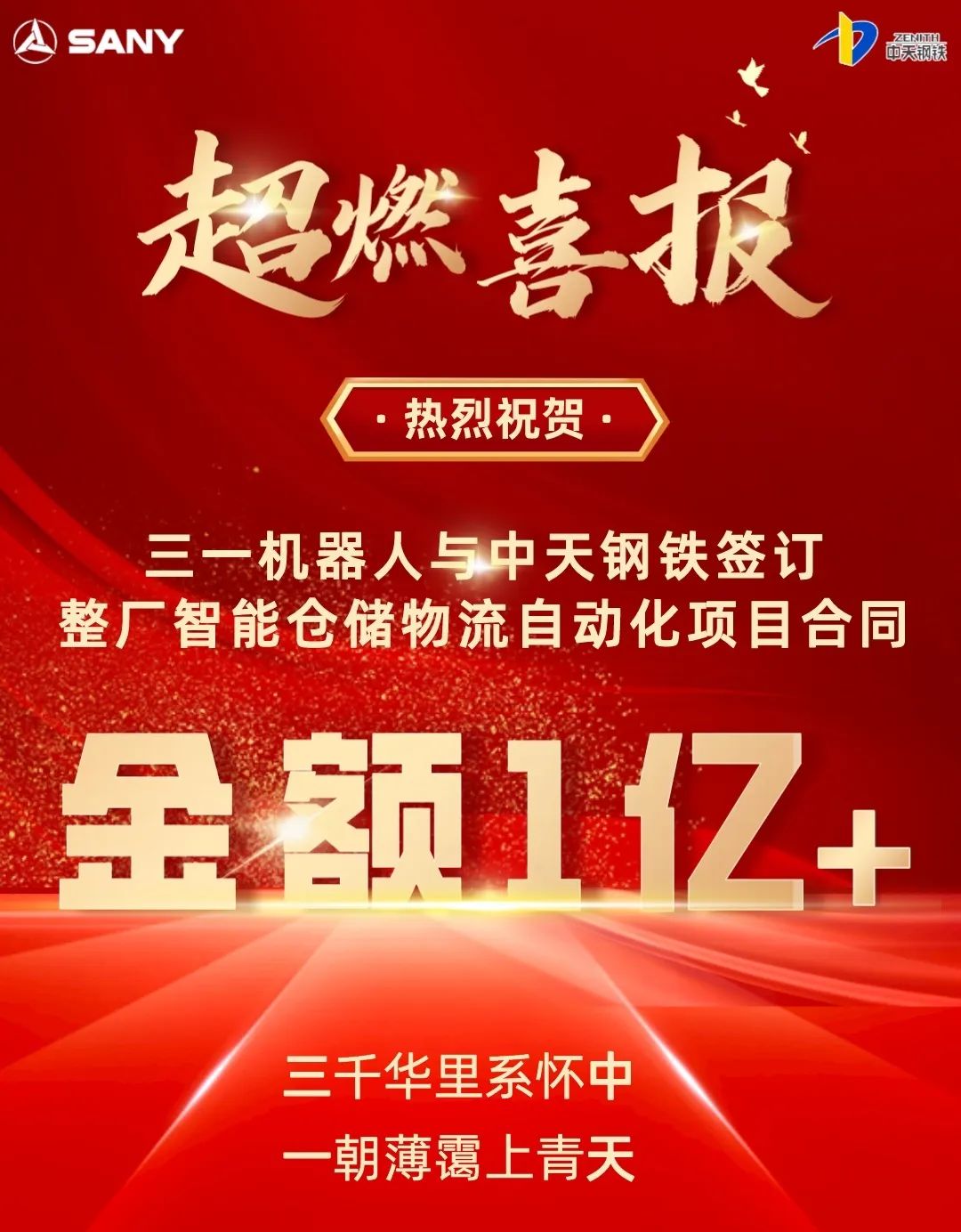 10月31日,三一机器人科技有限公司与中天钢铁集团(淮安)新材料有限公司在长沙签订超高强精品钢帘线整厂智能仓储物流自动化项目合同,合同总金额超1亿元人民币。