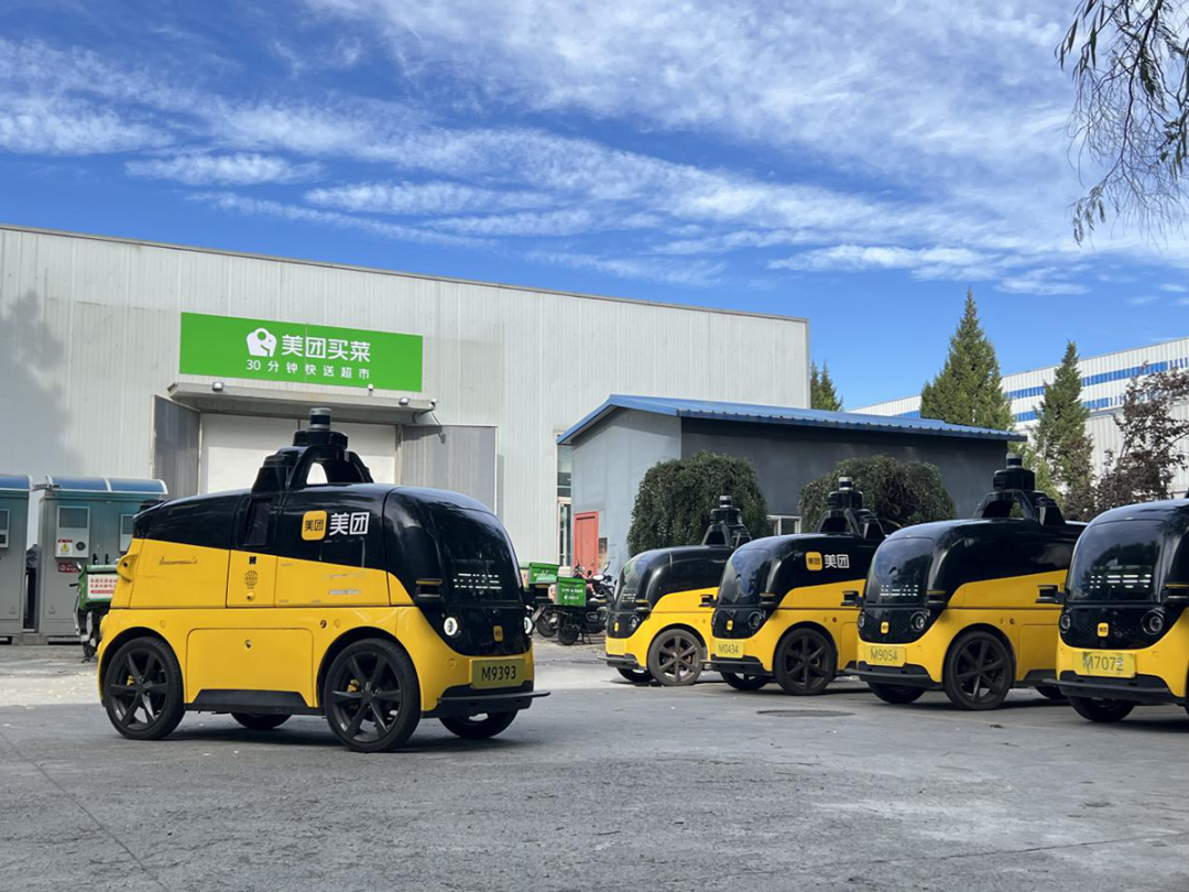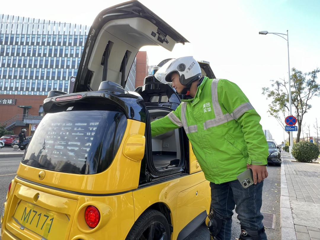 在美团买菜后沙峪站点,一辆辆美团自动配送车有序忙碌着。车辆自动驶入站点,拣货员根据订单提示,将货物装入车中,一键发车。路途中,自动配送车可以灵活避让路上车辆、行人,准确识别红绿灯,拐弯很顺畅,仿佛一个“老司机”。自动配送车行驶到接驳点后,配送员已等候在那里,他将接力为附近居民配送货物,整个过程约半个小时。