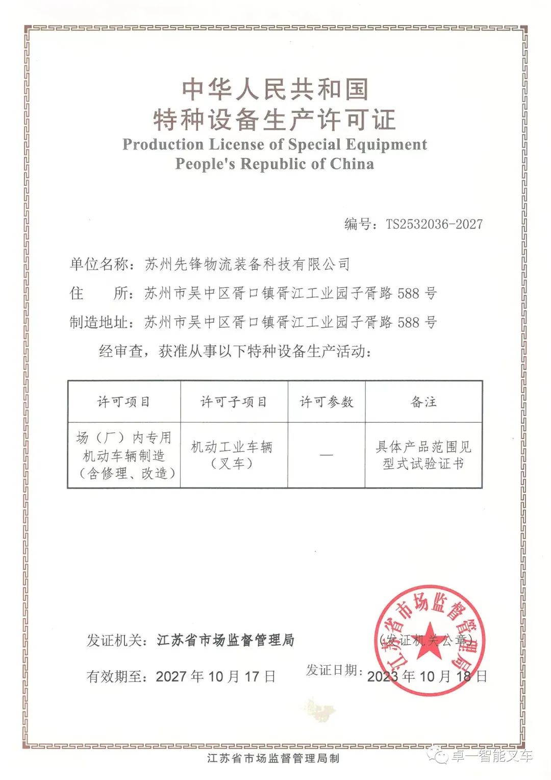 近日,经江苏省市场监督管理局审核批准,卓一智能叉车顺利通过新一次“特种设备生产许可证”换证评审。
