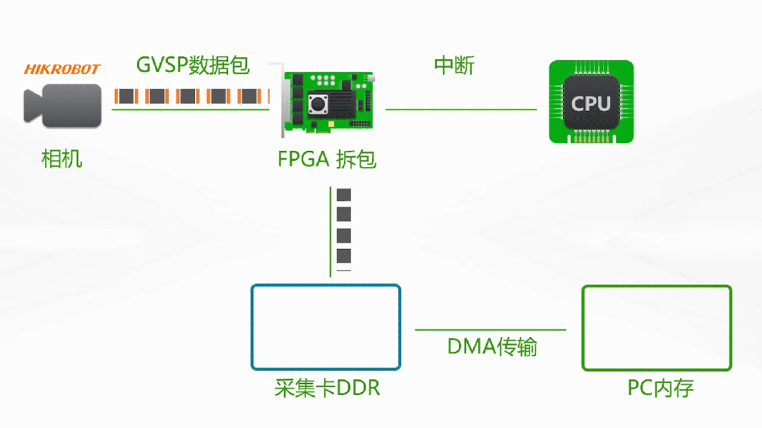 MV-GE1104卡端采用FPGA方案,在采集卡上即可对相机传输的GVSP数据包进行拆包组帧,直接通过DMA传输,直接将图像数据拷贝至PC内存中,从根本上解决了网络传输的丢包问题。这种传输模式几乎对PC负载没有消耗,可在CPU满负荷工作时依旧保持数据稳定传输。