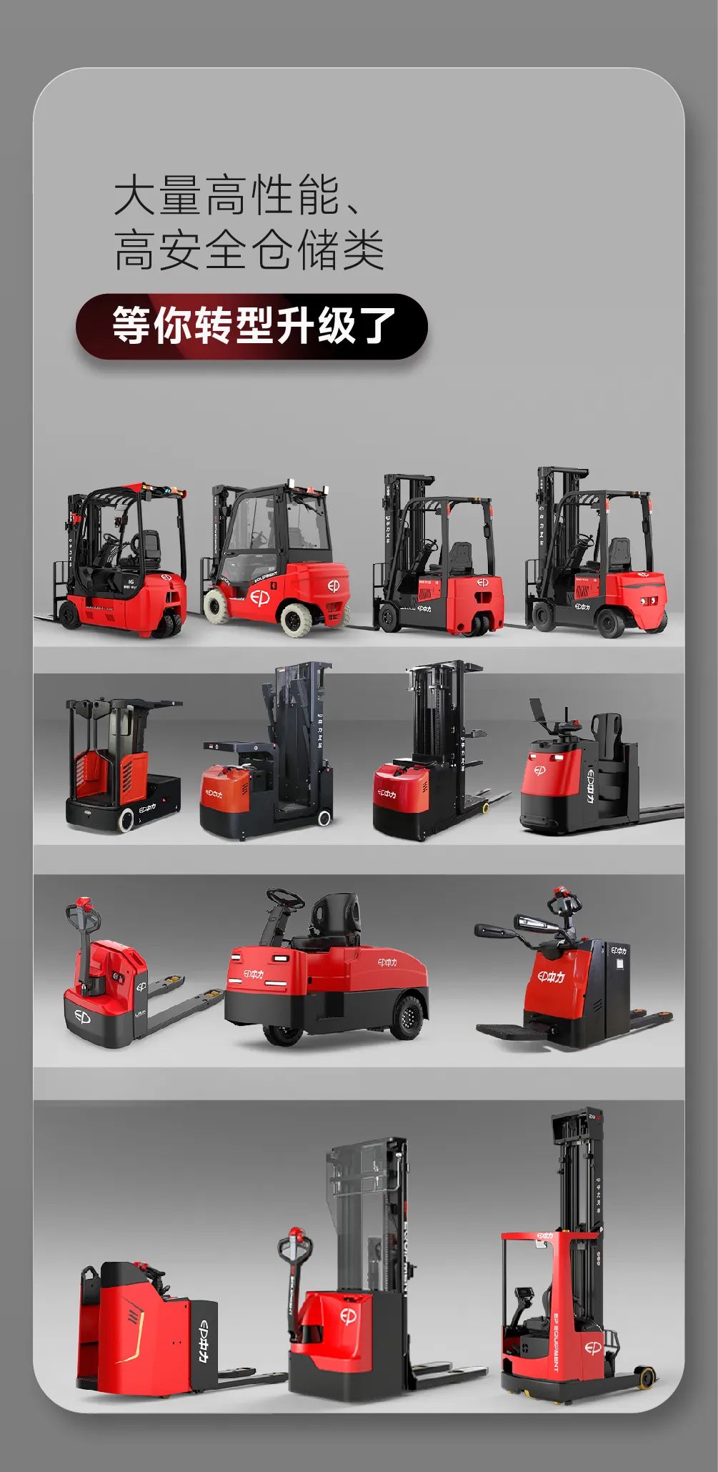 中力叉车(EP EQUIPMENT)是一家依靠产品创新而飞速成长的企业,专业从事电动仓储设备及叉车开发、制造、服务的全球性企业。