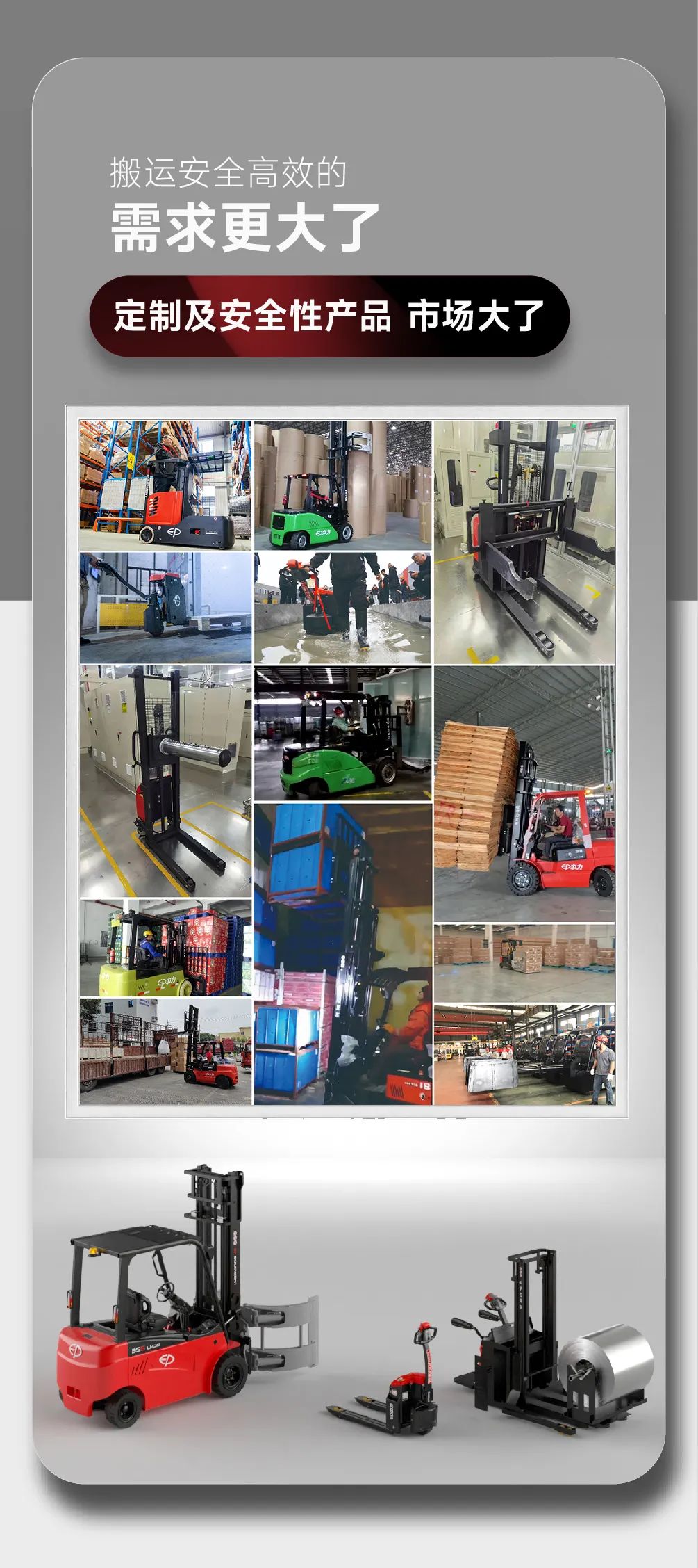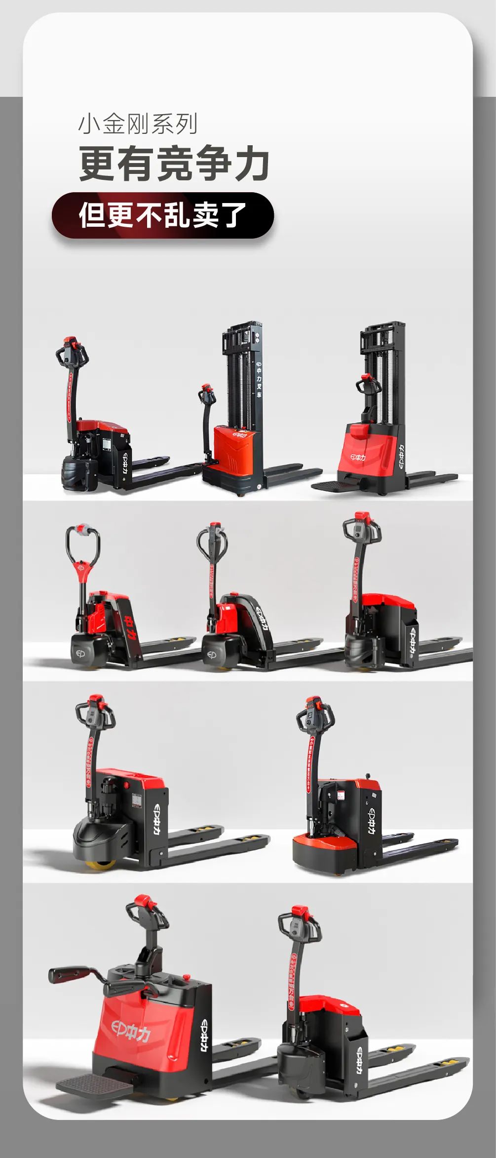 中力强调产品创新,坚持自主开发,致力于通过满足用户需求,为市场提供全系列物料搬运设备。