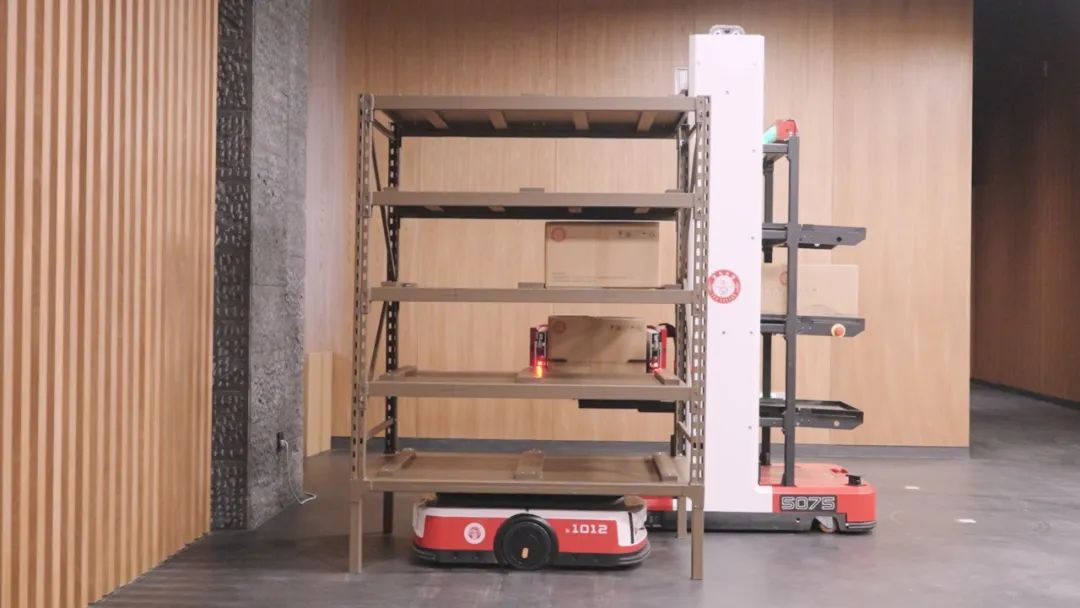 工作台使用潜伏机器人,进行跨楼层搬运,在茶窖内料箱机器人完成茶饼存储,实现多车型混行作业,以及不同导航方式间的平滑切换,大大提升了茶窖的仓储柔性。