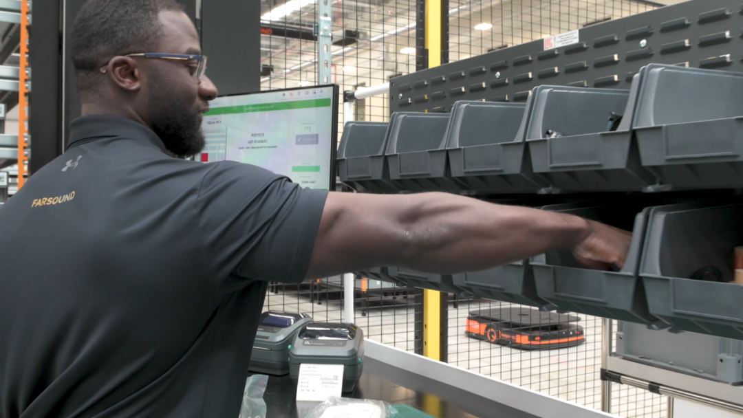 Farsound仓库投入使用 “货到人” 解决方案,布置了650个可移动货架和8个拣选站。同时,设置指示灯和PTL分拨墙引导员工作业,确保拣选、投放准确。该方案释放了32,000个料箱的额外存储空间,提升了场地空间利用率。