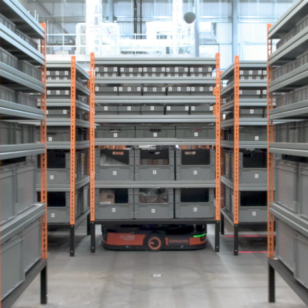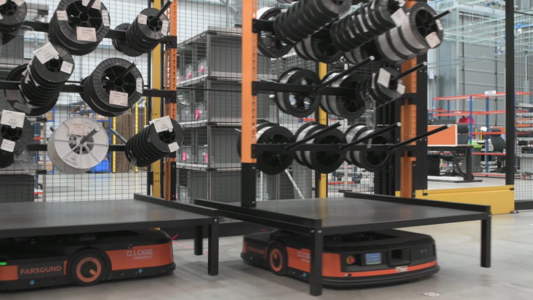 Farsound定制了多种货架来满足不同种类零部件的搬运需求;同时,海康机器人LMR可实现货架的柔性适配。