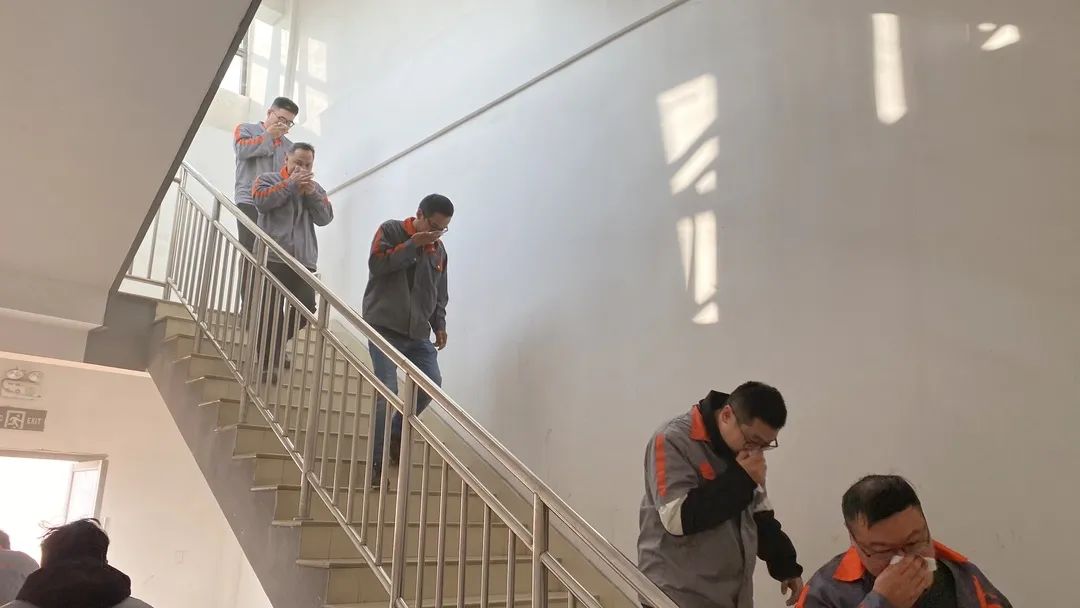 模拟警报声响起,全体职工立刻进入消防应急演练状态,模拟突发火灾时紧急疏散逃生的情况,用毛巾捂住口鼻,迅速有序地按规定路线从各办公室前往大楼西侧逃生楼梯撤离,在全体人员的配合下,顺利完成疏散演习。