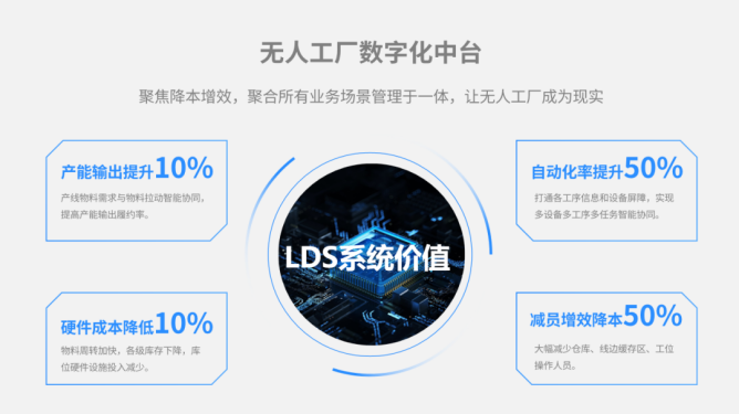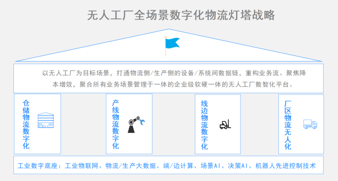 针对单点去人化、断点自动化等现象,磅旗科技以物流/生产大数据、端/边计算、场景AI、决策AI、机器人先进控制技术为技术底座,以智能制造数字中台LDS为核心,以无人工厂为目标场景,以降本增效为导向,打造出面向全场景全业务链数字化优化重构的“无人工厂物流灯塔战略”。