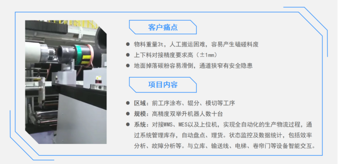 3、锂电材料产能高:仓库缓存物料多、仓库吞吐量大、劳动强度大,传统仓库利用“人工+叉车”的作业模式不仅会增加人工成本,还会降低货物周转效率。