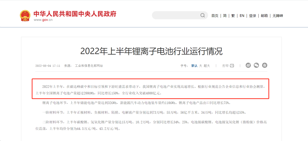 据工信部发布的《2022年上半年锂离子电池行业运行情况》显示,我国锂离子电池产量在2022年上半年超过了280GWh,同比增长150%,全行业收入突破了4800亿元。在锂离子电池环节,上半年储能电池产量达到32GWh,新能源汽车动力电池装车量约为110GWh,锂离子电池产品出口同比增长75%。