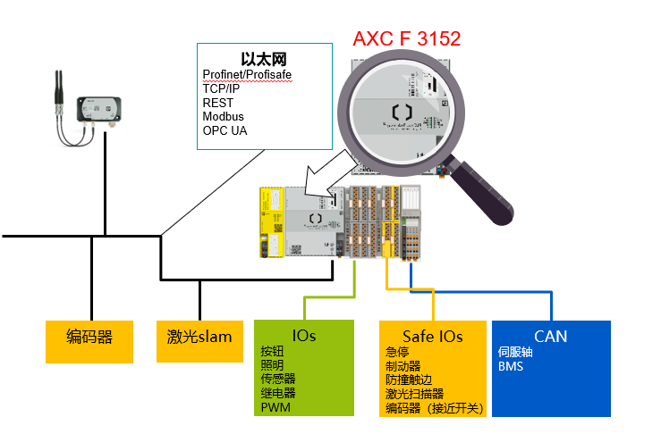 AGV的大脑采用基于PLCnext技术平台的控制器AXC F 3152, 可以同时部署轮控算法和SLAM算法,大大缩小目前市场工控机+小PLC所占用的空间;同时,该控制器可以在本体扩展IO模块使得部署更加紧凑;PLCnext平台支持丰富的API接口,满足不同的AGV车型和业务场景。
