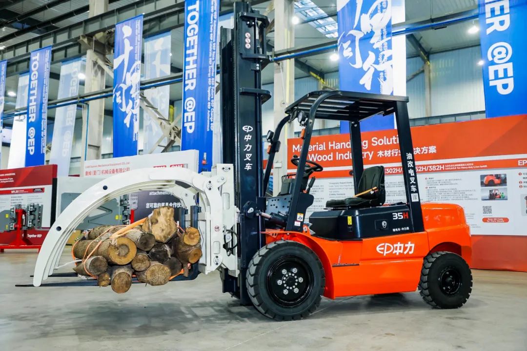 木业专区,中力行业定制的抱夹叉车,灵活抓取原木,快速搬运;针对木业板材区,车子还特殊优化了起升和行走,做到平稳起步和精细操作;