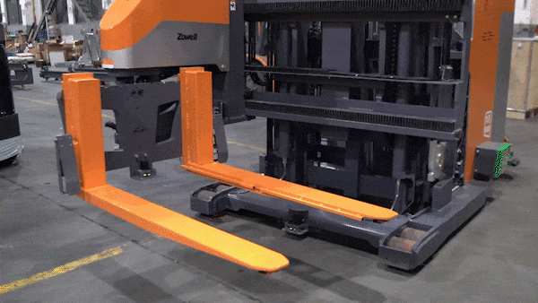 同时,这批三向AGV搭载了三向电动叉头,仅需不到10s就能在堆垛巷道内完成货叉180°旋转换向,成倍提升整体存取效率。