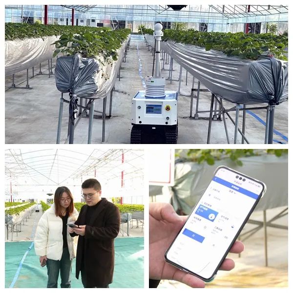 大棚内还安装了气温传感器、土壤传感器、自动滴灌等智能设备,24小时不间断工作,实时传送棚内温度、肥值、虫情等信息,方便管理人员随时控制棚内环境,有利于草莓生长。传统草莓种植,需要专人专工对田间进行管理。如今,智慧化大棚搭配农业巡检机器人,减少了15%的劳动用工、降低了20%的用水,提升了25%的劳动效率。