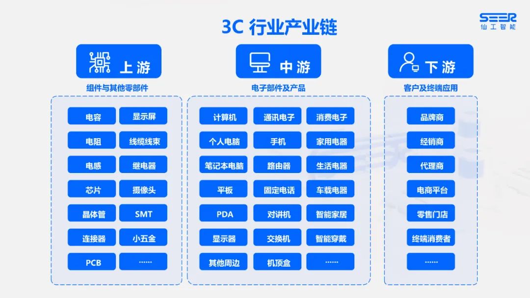 上图展示了 3C 行业产业链上中下游,其中移动机器人应用已经深入渗透在 3C 行业各个细分领域,并贯穿整个 3C 生产制造工艺的物流环节,仙工智能已实现原材料、在制品、成品等的搬运、装配、存储、分拣等环节的自动化和智能化。