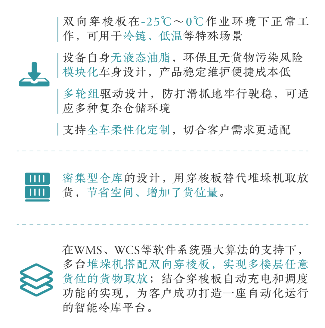 井松智能打造的智能冷库方案,基于一套完备的智能化技术应用逻辑,通过软硬件系统融合高效完成作业,把人力从恶劣环境中解放出来;诸如堆垛机、穿梭板等智能设备的自动化应用,有效提升空间利用率,大幅降低单位存储成本;结合数字孪生技术、智能物流管理系统的柔性配套,实现“人机料法环”全周期数据链通与衔接,为冷链客户开展精益可视数智化管理,提供了定制化设计、高进阶应用的解决思路。