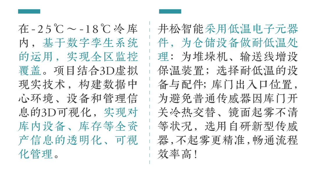 作为华北头部物流集团,公司发起智能化物流变革,计划通过场内数智化、可视化、精益化的一体化运用,打造山西及周边单体库容最大的一站式冷库智能工厂。鉴于此,井松智能为其量身定制一套基于数字孪生系统的智能冷库高阶方案。项目落地后,实现全库26026个货位内批量货物的集中存放与随时调取,有效满足年产20万吨高端肉类的冷链存储需求;对全场设备、库存、业务的实时监控,为开展精益化管理提供重要数智支撑。