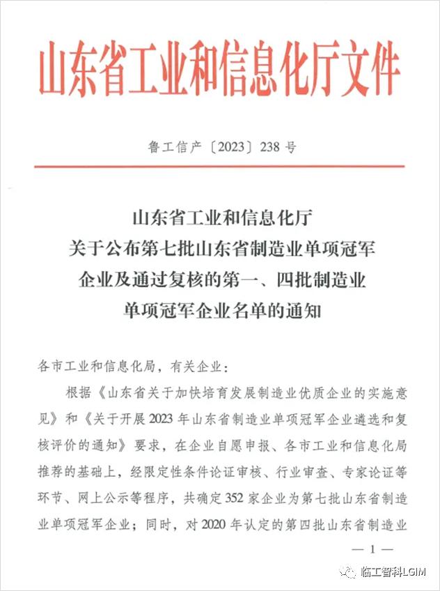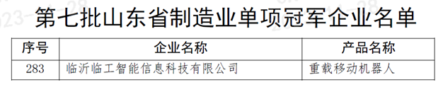 近日,山东省工业和信息化厅公布了第七批山东省制造业单项冠军企业名单,临沂临工智能信息科技有限公司成功入选,此次单项冠军企业入选,是对临工智科在行业地位、品牌价值及企业综合雄厚实力方面的充分肯定和高度认可。
