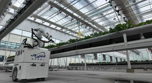 草莓采摘机器人由捷控机器人研发的底盘,珞石(山东)机器人集团有限公司研发的机器手臂结合而成,分为有轨机器人、无轨机器人两种。其中,无轨机器人通过AGV设定全场景轨道路线、点位,确保行进在正确路线上。