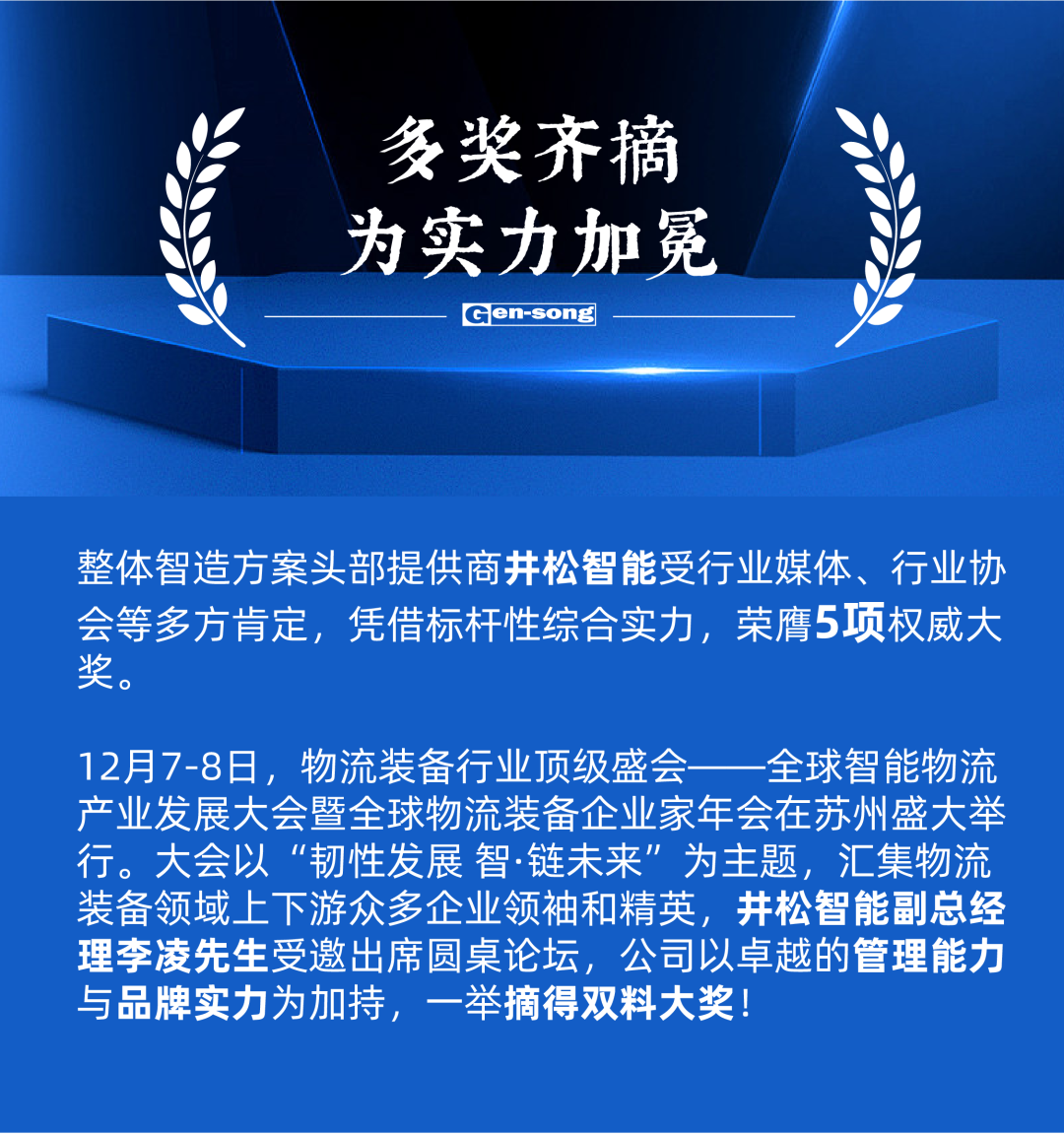 会议同期颁奖典礼作为重磅环节、备受瞩目。经过层层筛选和评审,井松智能董事长姚志坚先生获得“2023智能物流产业杰出贡献人物奖”,公司于同期摘得“2023智能物流产业卓越品牌奖”。