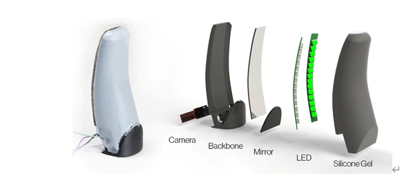 GelSight Svelte是由美国麻省理工学院(MIT)研发的一种机器人传感技术,这种传感器模仿人类手指的形状和功能。GelSight Svelte利用两面镜子反射和折射光线,使位于传感器底部的单个摄像头能够沿整个手指的长度“看到”。这个传感器拥有灵活的主体结构,可以在接触物体时测量手指的弯曲度,从而估算传感器所受的力。GelSight Svelte的设计使得机器人手能够执行多种抓取方式,提高了机器人手的灵活性和操作能力。