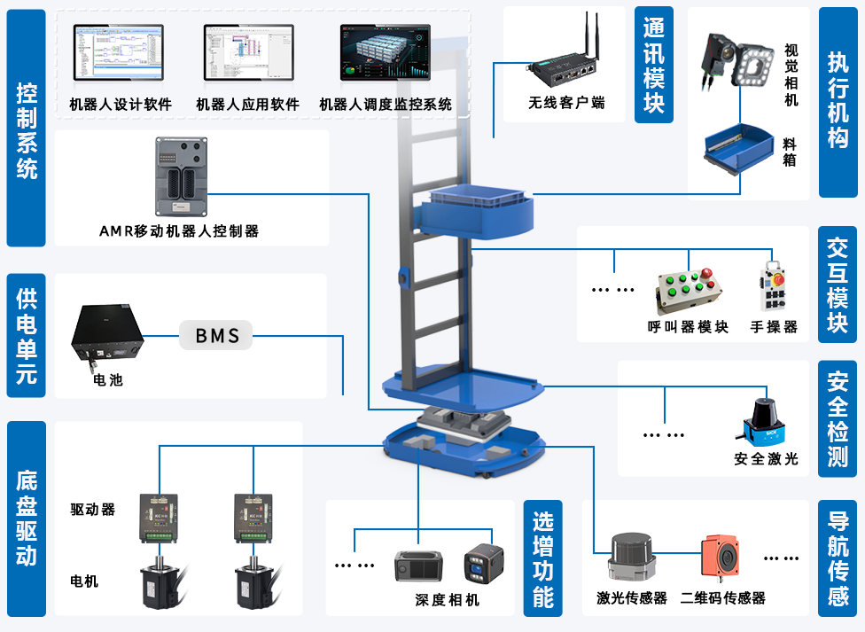 科聪料箱式移动机器人整体解决方案,根据移动机器人的整机功能,主要分为控制系统、导航传感、底盘驱动、执行机构、安全检测、交互模块、通讯模块、供电单元、选增功能等九大单元模块构成。