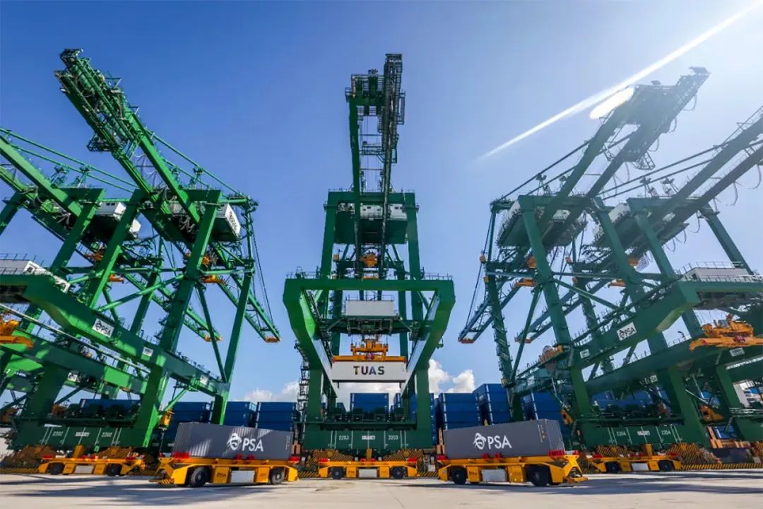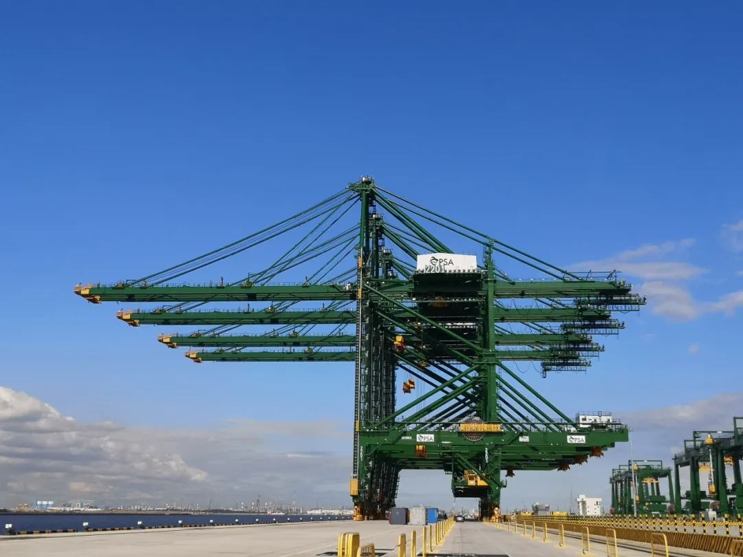 这是振华重工助力新加坡大士自动化码头快速发展所作的努力。新加坡大士自动化码头项目是新加坡政府规划的超级港口建设工程。该码头是集港口航运、临港工业、造船业及其他港口事业为一体的超级港口综合体,占地约13.37平方公里,拥有26公里深水泊位,处理能力将达到6500万标准箱,比新加坡港2021年3750万标准箱的处理能力几乎翻倍,将成为世界吞吐量最大的全自动化码头。从2019年开始,新加坡港务集团(PSA)与振华重工分批次签订了41台双小车自动化岸桥、108台自动化轨道吊以及44台轮胎吊、46台AGV、1台正面吊和2台全自动拆装锁销机。
