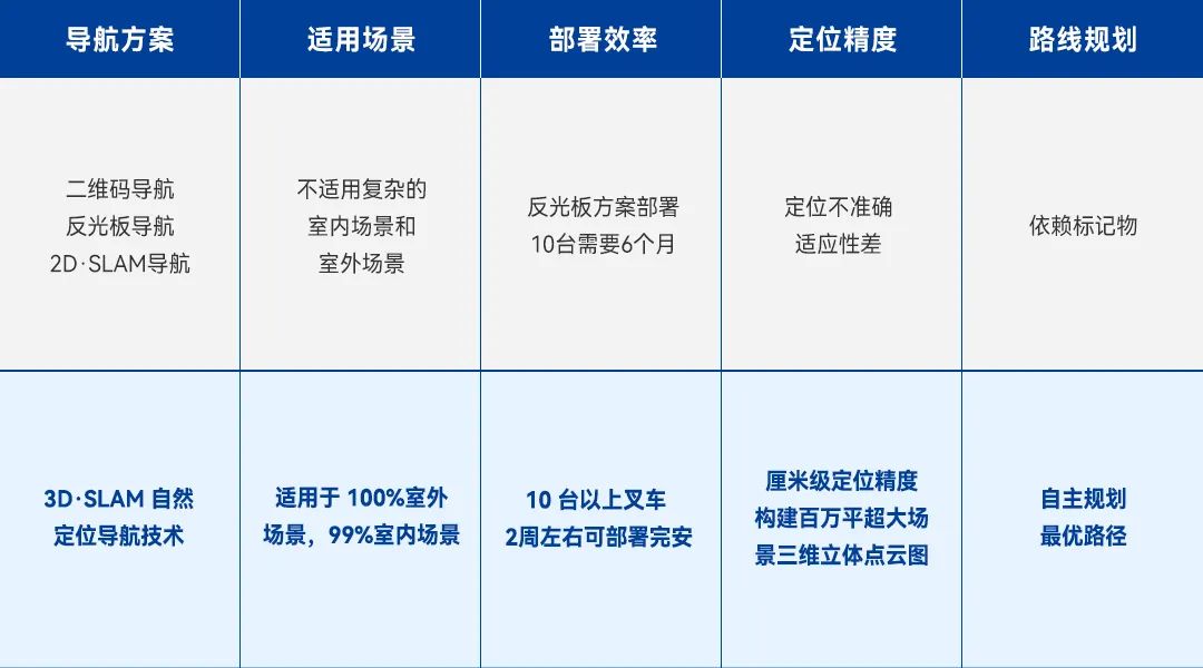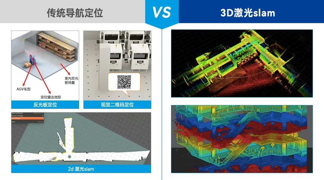根据场景环境或工厂规划来选择导航方案,一是看室内作业场景变化大不大,是否人机混合操作;二是复杂场景跨室外。3D SLAM定位导航技术的无人叉车,方便部署、柔性化高,可在各种复杂场景中实现高精度定位,满足个性化的搬运需求。