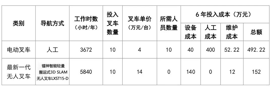 上表假定某仓库分别投入10辆电动叉车、镭神智能轻量搬运式3D SLAM无人叉车LXST15-D,并以6年折旧进行投资回报对比分析。采用镭神智能轻量搬运式3D SLAM无人叉车LXST15-D,6年总投入成本仅152万,比人工电动叉车节省了69%的投入成本、59%的时间成本。