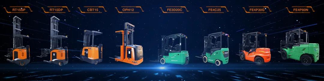 全球营销峰会上首度亮相的8款行业领先水平的新产品:剪叉式前移车RT15/20SP、RT15DP;站驾平衡重叉车CBT15;高位拣选车OPH12;短轴距平衡重叉车FE4C25/32、FE3D16/18/20C;FE4P30/35G;大吨位叉车FE4P60/70/80N。
