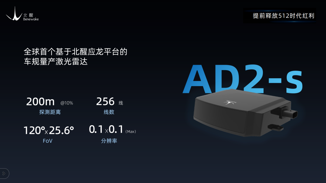 基于「北醒应龙」激光雷达平台,北醒推出了车规量产激光雷达AD2-s。这款产品在10%反射率的条件下仍能做到200m的探测距离能力,256线的感知力,120°x25.6°的视场角,可广泛应用于L2+及以上的智能驾驶场景,它将在今年内完成SOP,于今年底量产交付。