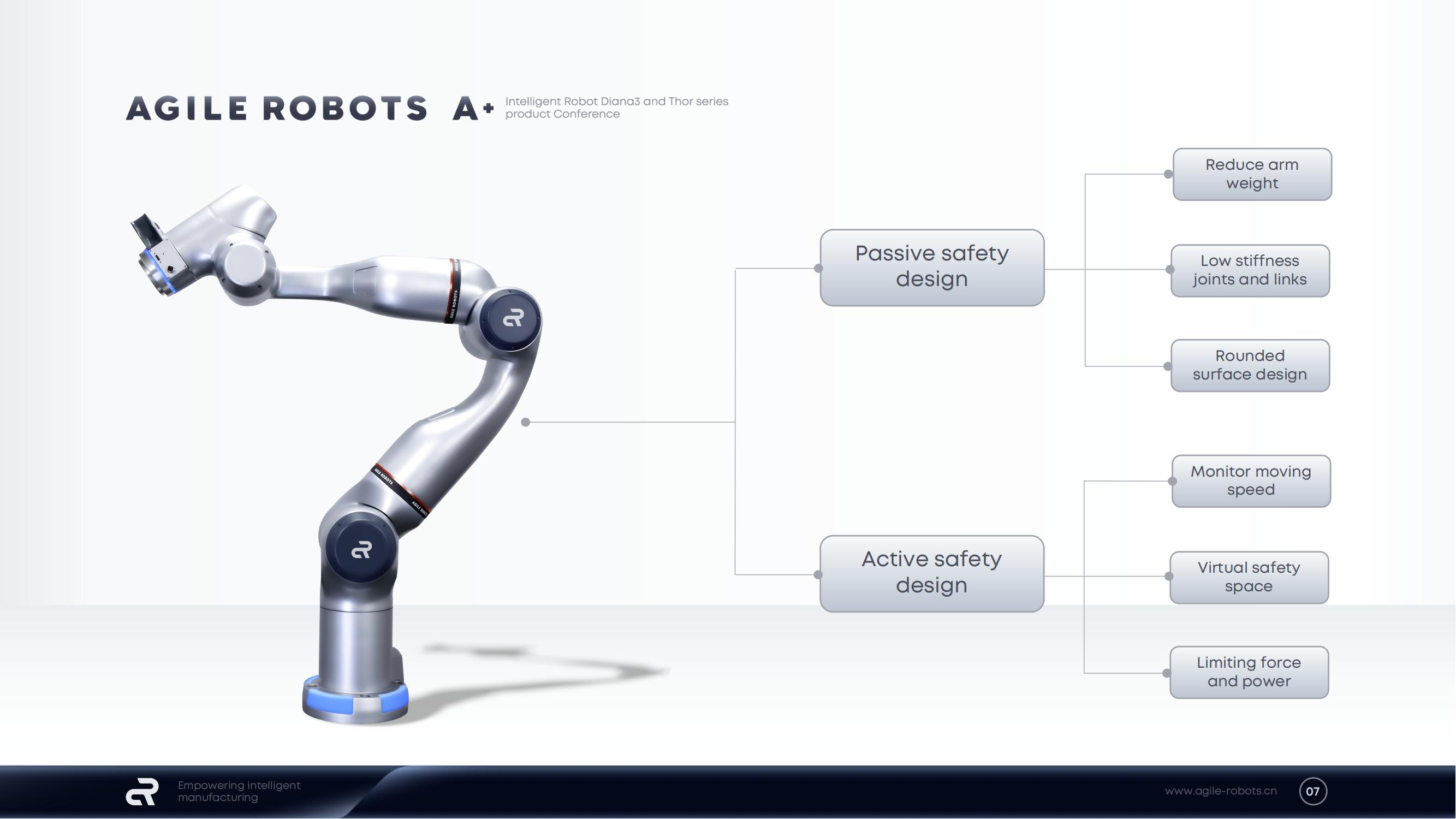 为了满足打磨、精细装配、恒力控制等紧凑空间高精度生产场景需要,Thor系列进行全面升级,推出了Thor7 Pro产品,该款产品最大特点在于搭载6自由度关节力控技术下,拥有更小的自重和小直径底座,占用面积更小,可在紧凑场景下实现快速灵活布置。性能方面,Thor7 Pro的TCP速度最高可达2.5m/s,配置高精度扭矩传感器,使其精度达到0.5N级别。此外,Thor7 Pro搭载可变阻尼与刚度能够满足不同打磨以及装配等任务场景。在安全性方面,Thor7 Pro搭载高灵敏碰撞检测和运动控制智能算法能力,能够实现极致安全和灵敏感知。