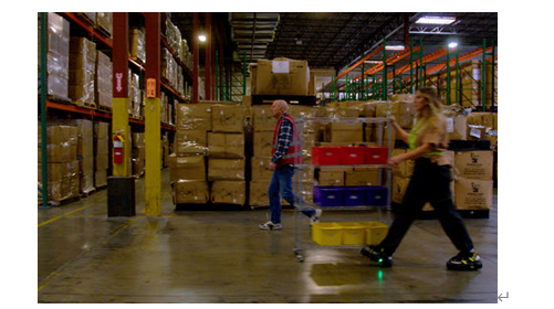 穿着 Shift Robotics 的 Moonwalkers 机器人鞋的仓库工人(例如图中这位从穿着普通鞋的同事身边经过的女士)比不穿着 Moonwalkers 的同事的工作效率高出 200% 以上。