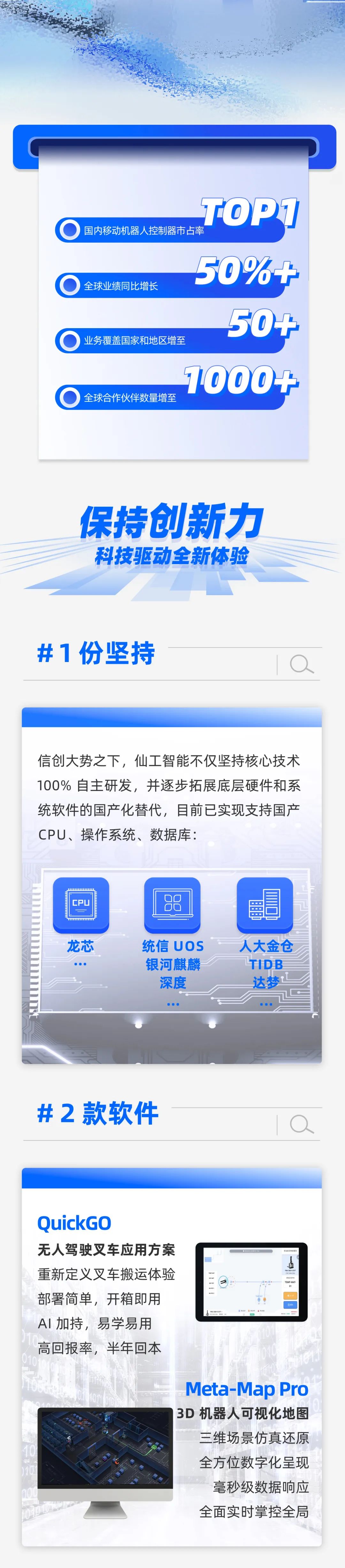 以【惠人达己,守正出奇,始终创业,追求极致】的品牌价值观为导向,凭借卓越的产品力、方案力与服务力,仙工智能为西门子、菲尼克斯、潍柴动力、格力等全球 800 多家企业提供服务。客户覆盖半导体、3C、锂电、光伏、汽车零部件、PCB、纺织、医疗等行业,项目交付率达 100%。仙工智能,以实力引领工业物流智能化进程。