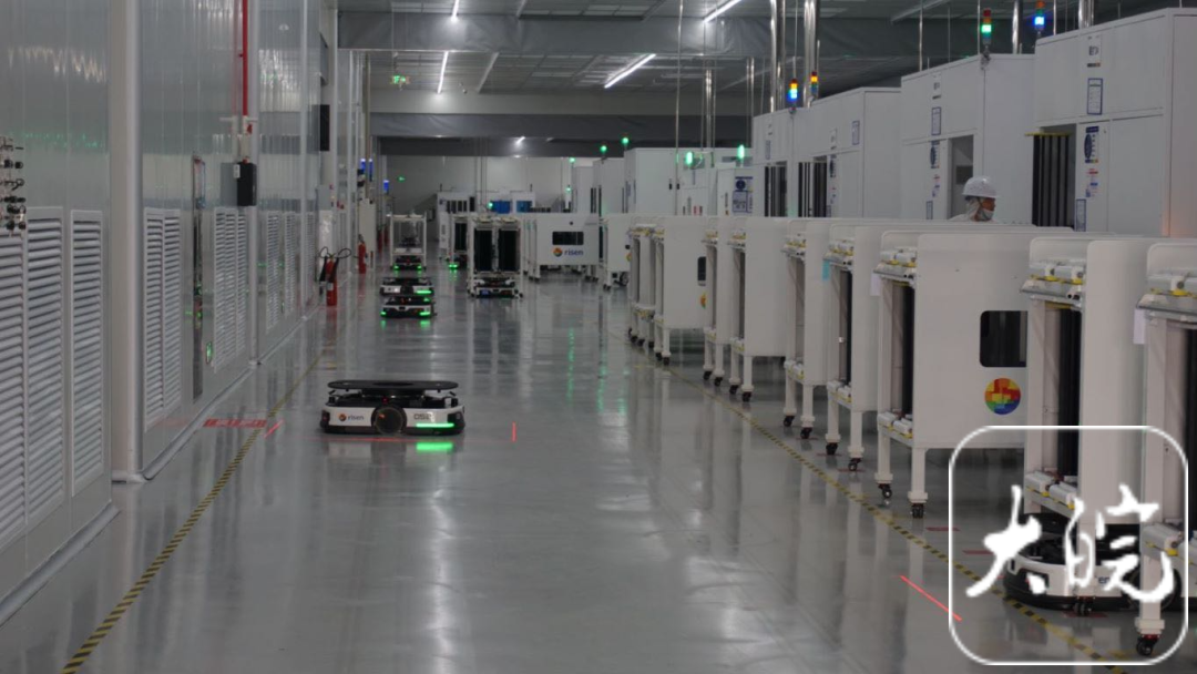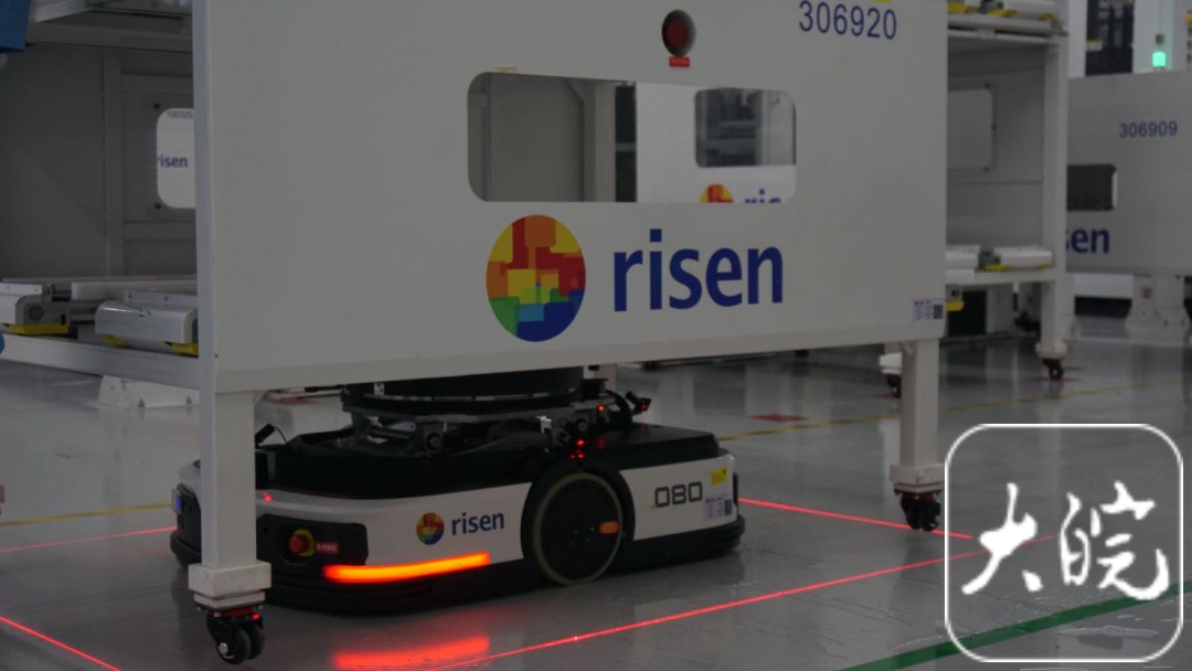 走进安徽滁州南谯区徐州路与海宁路交口附近的东方日升高效电池及光伏组件项目的电池车间,可以看到一台台AGV小车忙忙碌碌地工作着。这些带万向轮的扁平状的“小机器人”,大约只有30厘米高,自动穿梭于车间的不同区域,“驼”起货架车,给机器设备上料、下料等。
