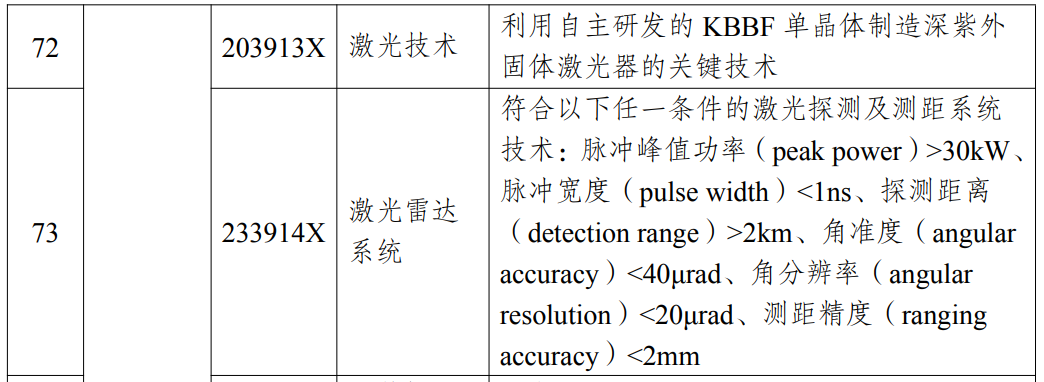 符合以下任一条件的激光探测及测距系统技术:脉冲峰值功率(peak power)>30kW、脉冲宽度(pulse width)<1ns、探测距离(detection range)>2km、角准度(angular accuracy)<40μrad、角分辨率(angular resolution)<20μrad、测距精度(ranging accuracy)<2mm。
