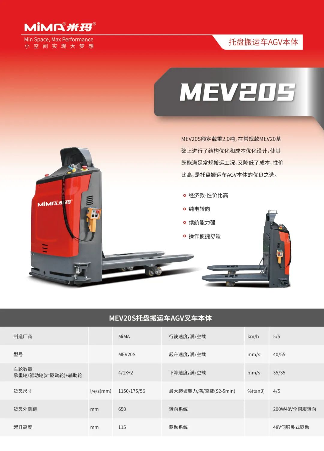MiMA米玛对于该款车型进行成本优化和结构优化设计,兼备经济与实用两大优势,支撑企业大规模使用、常态化作业。MEV20S经济款极大地降低成本,提升仓储运输效率,是托盘搬运车AGV本体领域的卓越产品。
