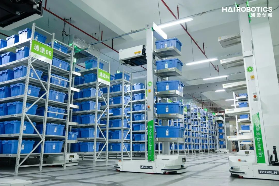 庞大业务规模和高效的运营策略背后,少不了物流体系和自动化设备的支撑。2023年大参林广西南宁的智慧物流仓,引入了海柔的箱式仓储机器人(Automated Case-handling Mobile Robot,简称ACR)系统,在2700平米仓库内实现了8000件SKU的出入库无人化作业,整体拣货效率提升了3倍。