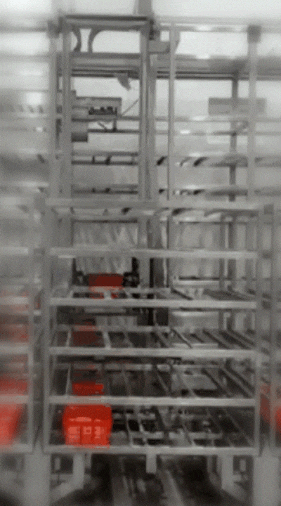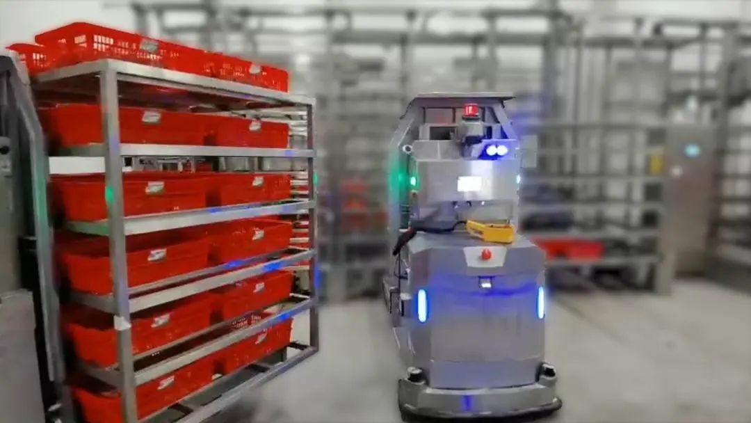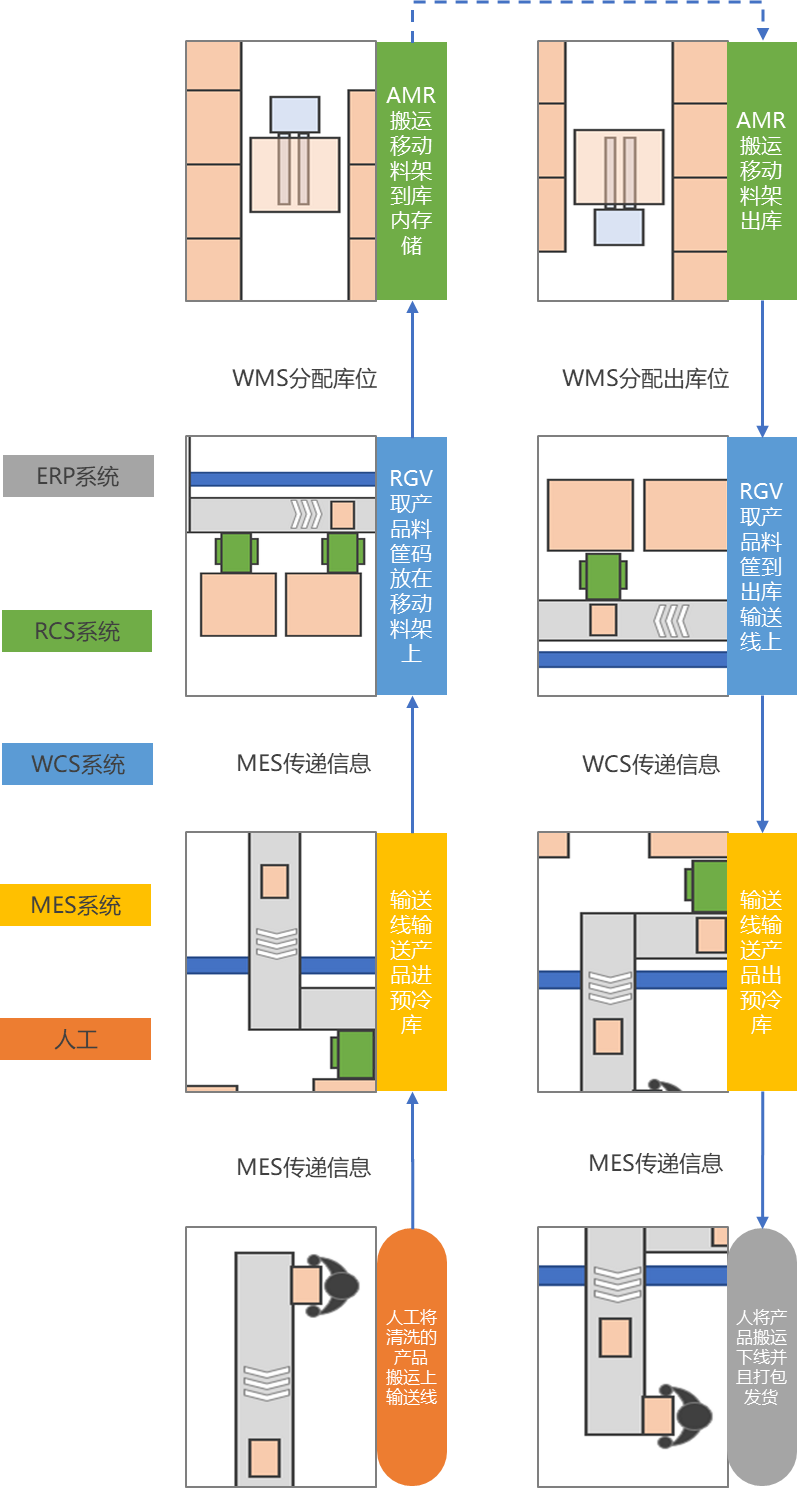 ⑤当有出库需求时,AMR将装满预冷产品的大料架搬运至出库RGV处;