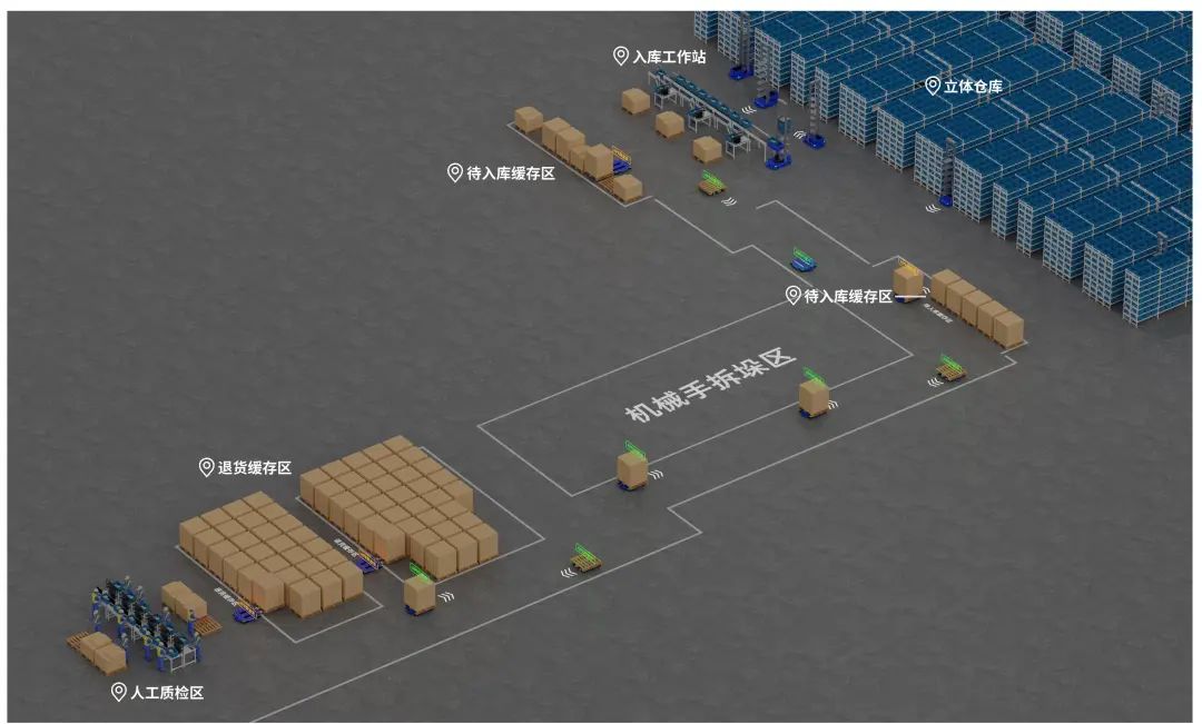 APR托盘机器人将质检合格的货物搬运至待入库缓存区,卸货完成后返回待命点或执行下一个任务,系统自动更新库位信息。