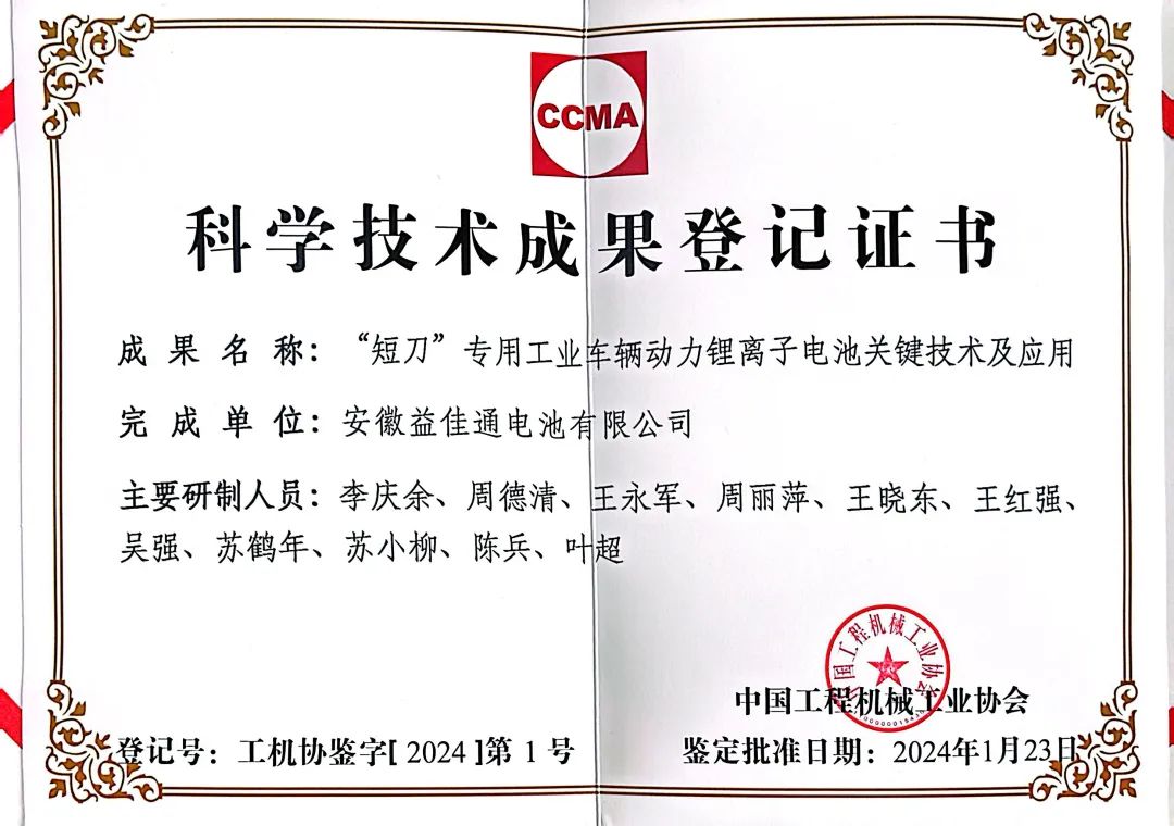 2024年1月22日,中国工程机械工业协会组织召开了益佳通电池完成的“大功率高安全“短刀”专用工业车辆动力锂离子电池关键技术及应用”项目科技成果鉴定会。
