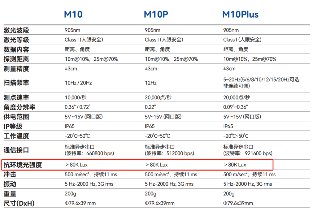 M10系列官方宣传抗环境光强度为>80k Lux,而经过实际测试,M10系列在室外110k Lux光照强度下工作性能表现优异,实际抗环境光强度远超某公司列举的30k Lux,可有效保障机器人在室外环境下稳定可靠运行。