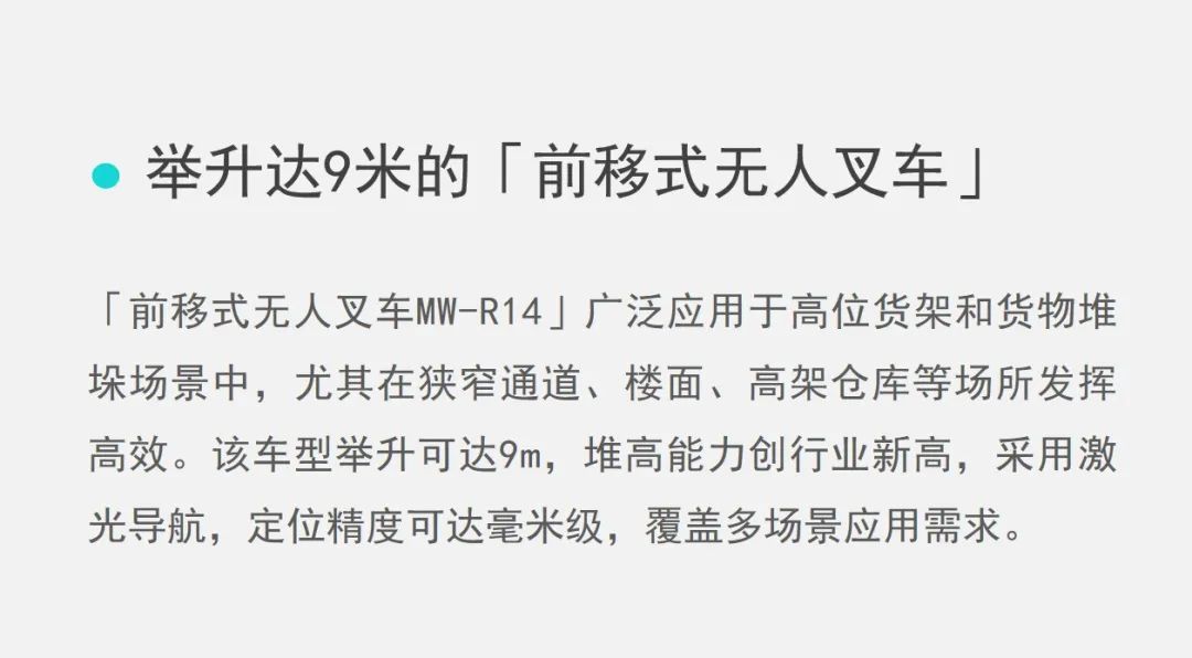 此外,前移式无人叉车MW-R14具备举高功能,极大提升仓库空间利用率,多台机器人在同一场地作业,可自主规划最优路径,智能交管调度,避免锁车、堵车等情况。