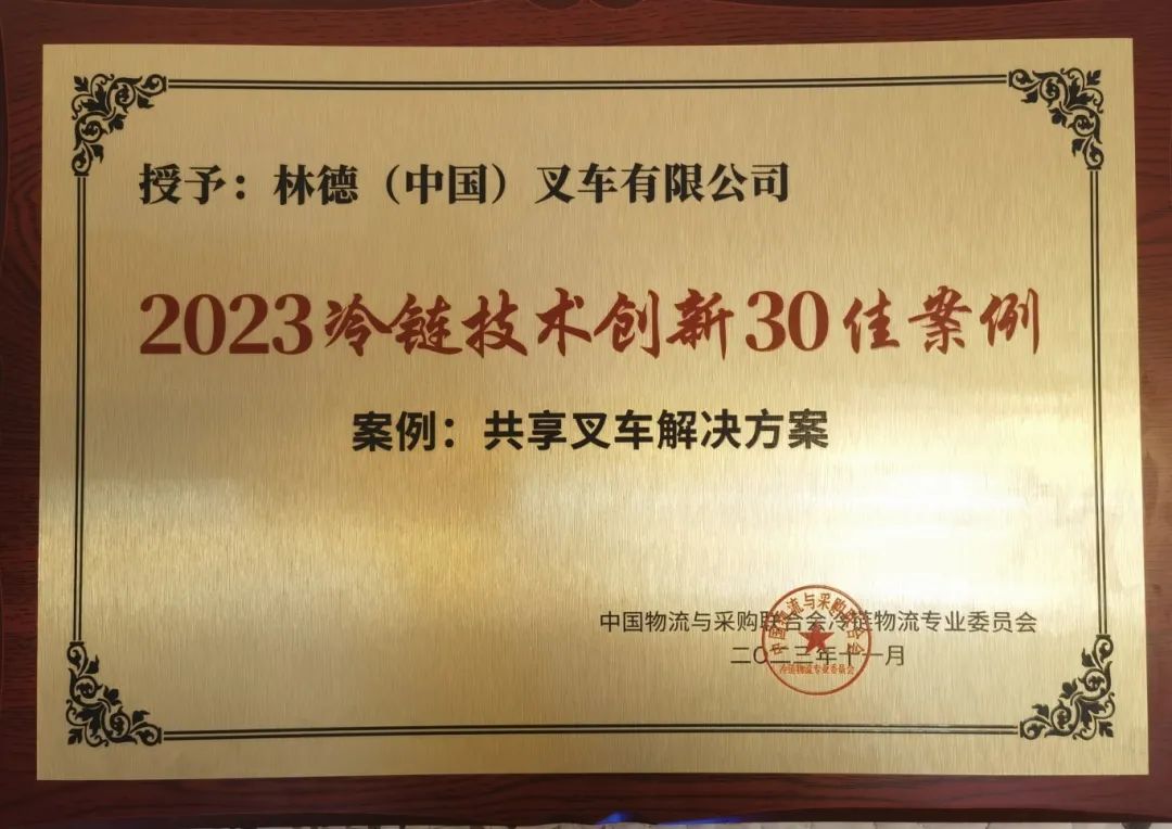 近期,林德叉车凭借创新的共享叉车解决方案在2023食品冷链技术创新大会荣获“2023冷链技术创新30佳案例”。