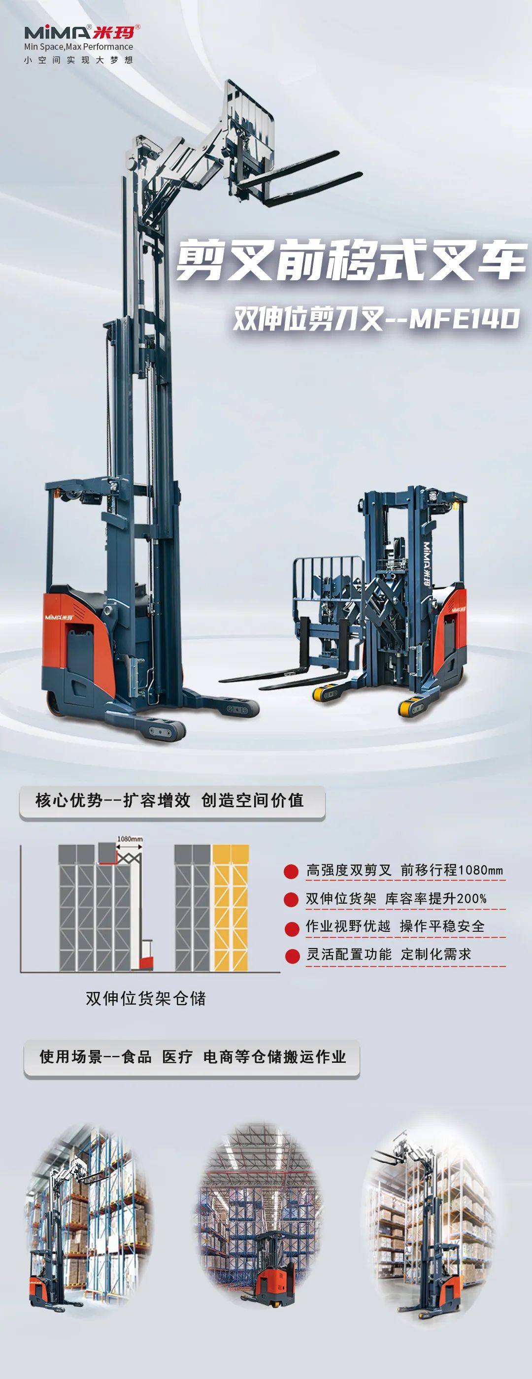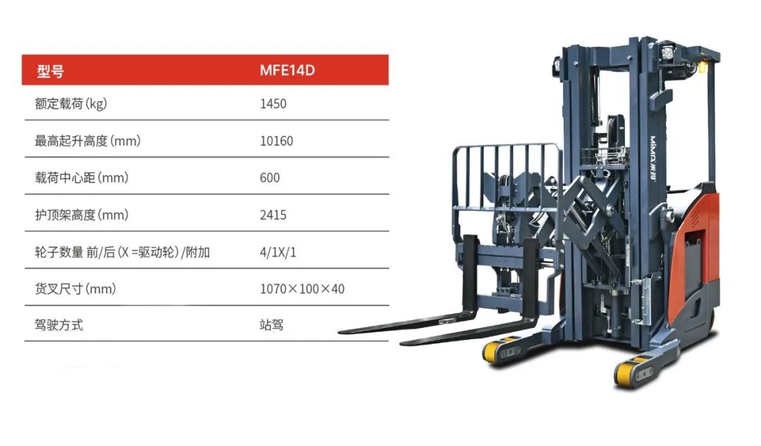 MiMA米玛剪叉前移式叉车MFE系列,在保留MiMA米玛前移式叉车固有的优良性能的前提下,巧妙地运用双剪刀伸缩货叉结构,实现了双伸位双层货架的高效利用。即在仓库环境中,它能够轻松作业于并排摆放的四排货架,进而减少仓库过道的数量,最大化利用仓库空间,实现高密度存储,提升仓储容积率,降低企业运营成本。
