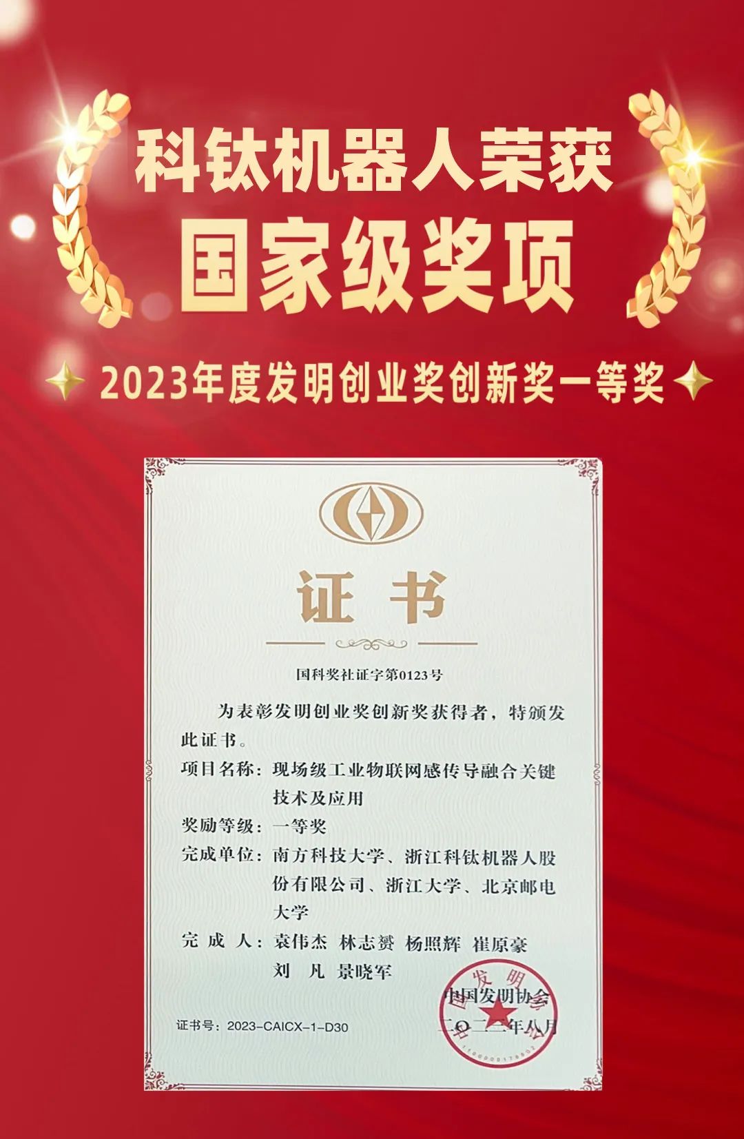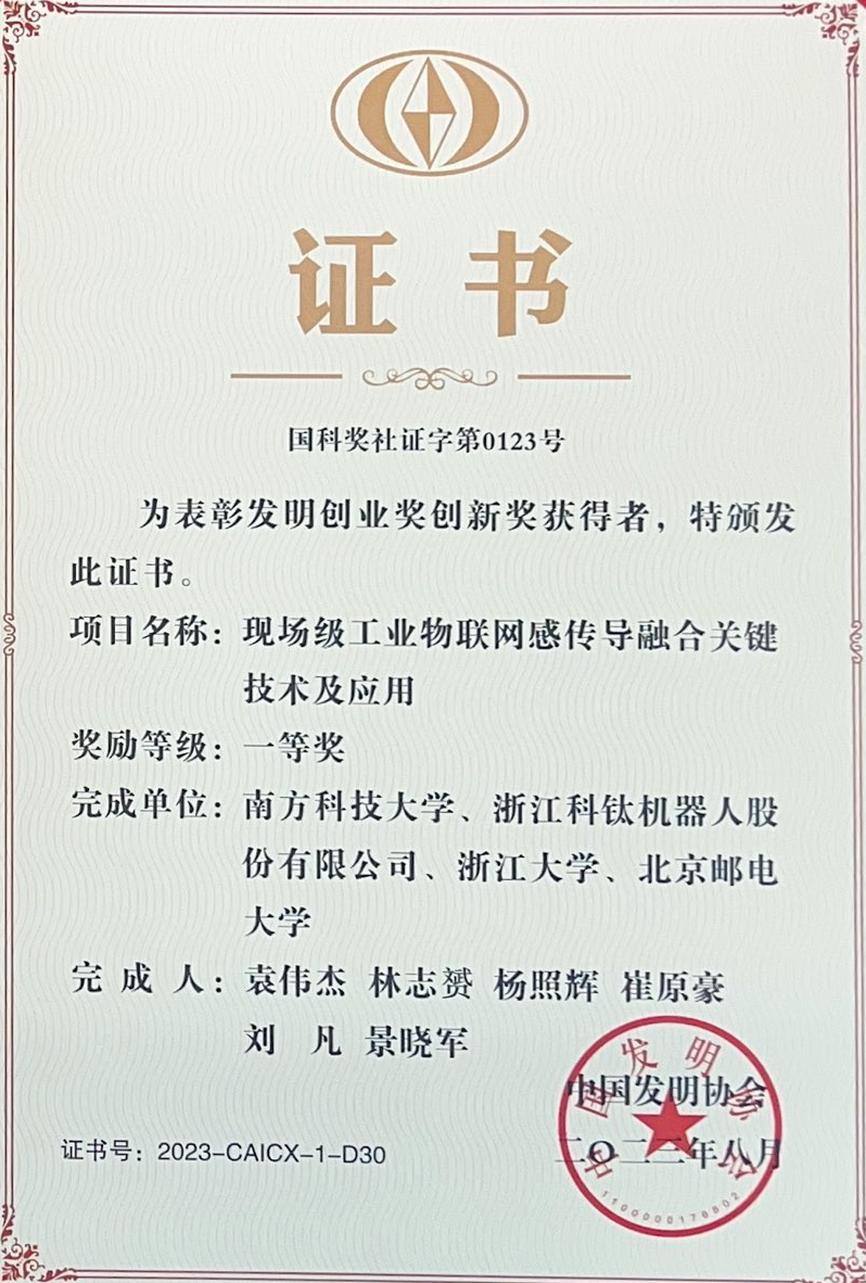 根据中国发明协会公布2023年度发明创业奖创新奖评审结果,由南方科技大学、浙江科钛机器人股份有限公司、浙江大学、北京邮电大学联合完成的“现场级工业物联网感传导融合关键技术及应用”项目,荣获中国发明协会2023年度发明创业奖创新奖一等奖!科钛机器人创始人林志赟作为项目第二完成人也共同获得此荣誉。