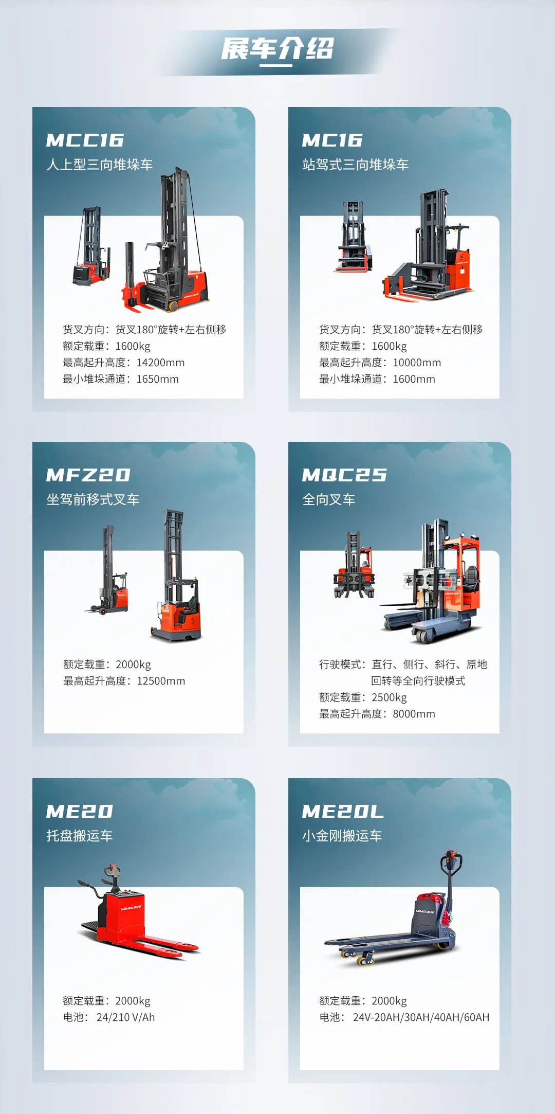 二十多年不断进取, MIMA 品牌以公司强大的科研创新团队为依托,以“安全、耐用、舒适、低碳(环保)”为设计理念,为客户提供500KG —100000KG应用解决方案、仓储设备及 相关服务。 通过不断的技术创新和专利积累,现在我们的产品已涉及12大类50多个品种,如电动托盘车搬运车、托盘堆垛车、前移式叉车、平衡重式叉车、牵引拖车、拣选车、窄巷道叉车、四向叉车、侧面叉车和非常物流设备、AGV、无人巷道堆垛机等等。产品广泛 应用于医药、食品、化工、电子、机械、家具、物流等各个行业。