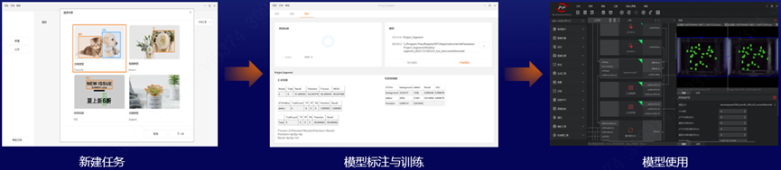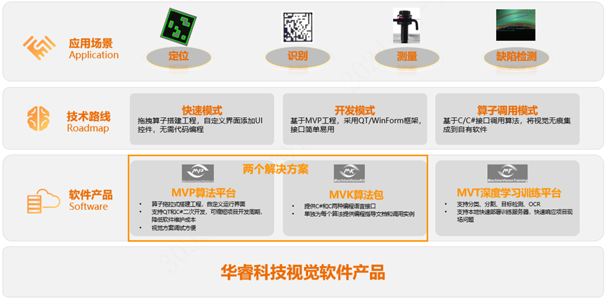 华睿科技作为一家专注于机器视觉研发、生产和销售的专业性公司,我们致力于面向重点行业提供涵盖硬件、软件、算法在内的完整端到端解决方案,携手合作伙伴,共同演绎千行百业的智能高效生产模式。 华睿科技始终坚持创新是公司发展的原动力,内部设有五大研发部门,所有视觉软件产品都基于同一套视觉算法。在此算法基础上,我们根据不同客户和场景需求推出两个软件解决方案,分别是算法平台MVP和算法包MVK。 算法平台MVP是一款图形化界面交互软件,我们将视觉通用处理算法抽象为工具块,分成13大类工具: 如下图所示,用户只需要在了解工具作用和参数如何配置后,通过拖拽添加工具和连线实现数据交互即可,可以迅速完成视觉工程搭建,入门简单使用方便。完成工程搭建后,可以在自定义界面通过添加控件,绑定数据源来制作用户界面。整个过程无需编程就能实现图像采集、图像处理、通讯输出及用户界面设计,大大节省了项目时间和工作量。 算法包MVK是一套完善的标准的机器视觉算法包,提供了定位、识别、测量、深度学习、Region、XLD、标定、图像处理等算法,用户可以调用相关算法的C/C#接口,无需关注底层算法的实现,只专注于上层自己的软件逻辑即可,更加无痕、高度集成的使用视觉功能,开发灵活、封装自由。这款产品尤其适用于设备商使用。 基于算法平台MVP和算法包MVK,我们提供了三条技术路线供客户完成视觉应用。 在快速模式下,用户只需要在MVP软件里添加相关工具搭建视觉工程,在自定义界面里添加控件搭建用户界面,过程中用户无需编写代码就能完成一个视觉应用。 在路线一快速模式下用户无需编写代码即可完成视觉应用,但有的需求中,用户可能对界面有更多的设计要求,或者需要将视觉功能嵌入到自己的上位机软件中,这种情况需要使用MVP的二次开发功能。目前MVP支持基于WinForm或Qt框架进行二次开发,并且为了减轻开发人员的工作量,我们将MVP的工具箱、流程编辑区、图像显示区和参数配置区抽象为独立的公共组件,用户可以根据需求在二次开发中添加相关控件,实现在二次开发软件中修改MVP程序,这大大方便了现场调试人员进行参数调整。 算子调用模式是基于算法包MVK产品,这种模式下,当用户需要在自己的软件中嵌入视觉功能,只需要使用我们提供的算法动态库文件,调用相关接口即可实现视觉功能。 通过以上三条技术路线,用户可以实现各种定位、识别、测量、检测等四种应用场景。 在视觉的通用四大场景中,定位、测量、识别通常来说实现难度低、检出效果稳定,但对于缺陷检测场景,往往传统算法实现起来难度大,检出效果不稳定,基于此,我们提供了深度学习方法实现缺陷检测,用户可以根据需求选择传统算法、深度学习、传统算法+深度学习方式完成视觉应用。 深度学习训练平台MVT集成了程序管理,样本标定,样本增强、模型结果测试分析一体化功能,内置神经网络模型方便用户更加便捷对视觉任务进行模型训练、测试、选择。该平台的深度学习视觉算法任务涵盖了分类、检测、语义分割、实例分割、字符识别、文本行识别场景,每个类型的任务都内置了大、中、小的模型,支持根据任务的复杂程度选择相应模型大小。 通过多种方式,可以简化标注工作量,如下列图片所示。(从左到右分别是:实例分割标注、语义分割标注、单字符标注、文本行标注、分类标注。) 在项目中可以先用几十张图片训练一个初步模型,再将此模型作为预标定模型标注其他图片,人工对标注不准确的结果进行调整,这同样可以节省很多的标注工作量。 使用模型预标定 在MVT里训练得到模型后,直接在MVP里添加深度学习相关工具,导入深度学习模型,即可获得工具结果。同时也可以把深度学习结果传给其他工具作为依赖项或者把其他工具的结果传给深度学习工具,实现了深度学习与传统算法的无缝结合。 MVT与MVP配合 一套产品体系,两个解决方案,三条技术路线,四大应用场景,面向视觉,华睿科技构建了一套成熟的成套软件方案。在未来,我们将继续朝着降低软件使用门槛、缩短项目开发周期的方向持续耕耘,期待为客户源源不断提供更优更高效的软件产品!