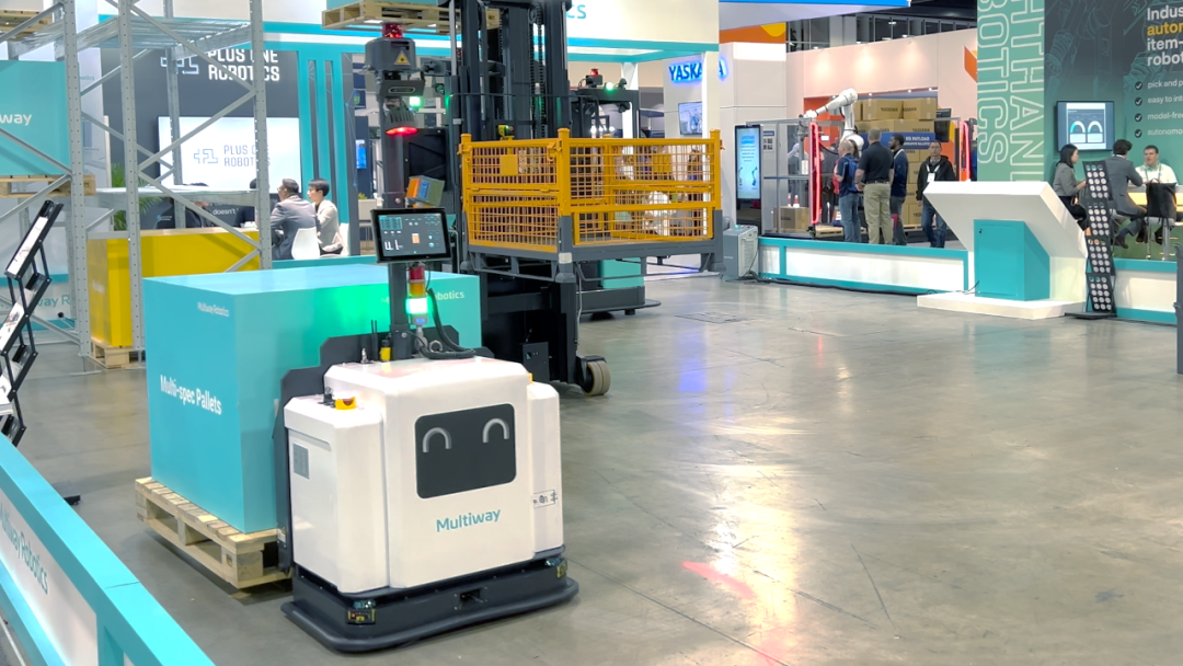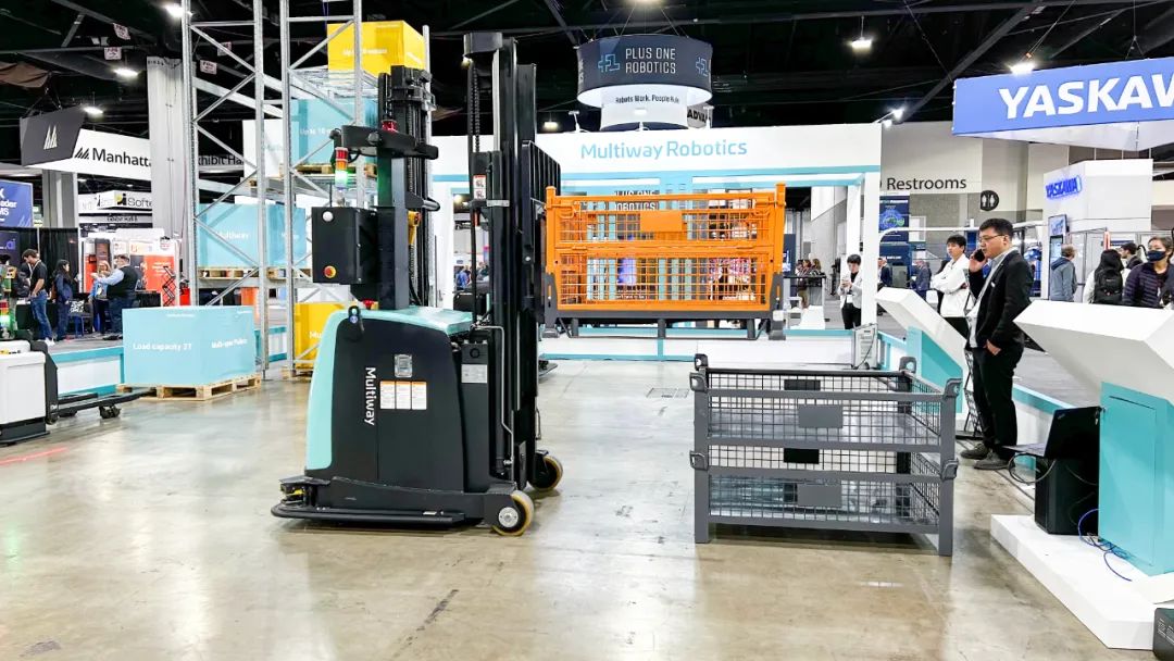 劢微机器人携行业首发、无损兼容田字托盘的无人叉车「微蜂X20S」、多场景适配的「平衡重式无人叉车MW-SE15」、举高可达10米用于高位存取「前移式无人叉车MW-R20」亮相Modex展,通过平面搬运、料笼堆叠、高位上下架以及软件系统相关的天眼系统解决方案、RCS等场景演示,向参展观众呈现劢微机器人软硬件一体化智能物流解决方案。