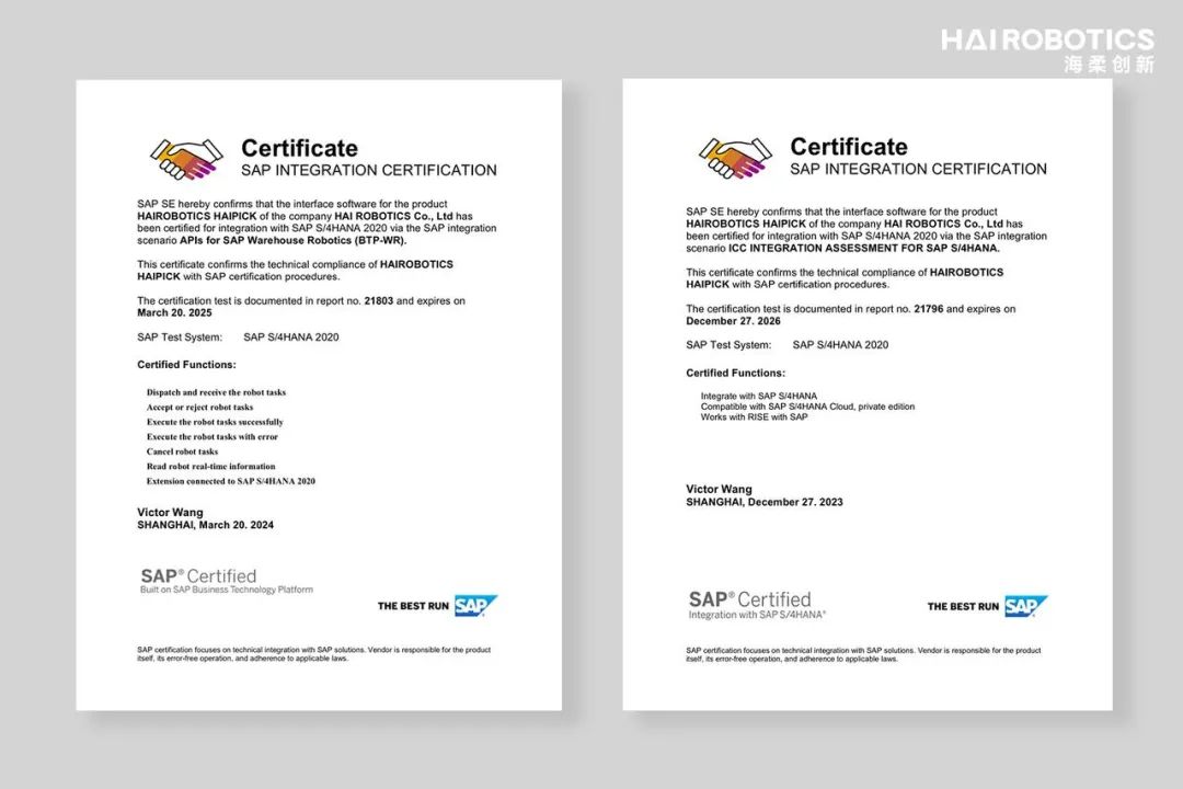 双方共同宣布:箱式仓储机器人系统专家——海柔创新正式成为SAP官方合作伙伴,海柔创新的HaiPick System解决方案(包含ACR机器人)入选SAP PartnerEdge Build合作伙伴认证项目。同时,海柔创新的HaiPick System成功获得了SAP全球官方认证,成为全球首批与SAP EWM robotics产品无缝集成的仓储机器人厂商。