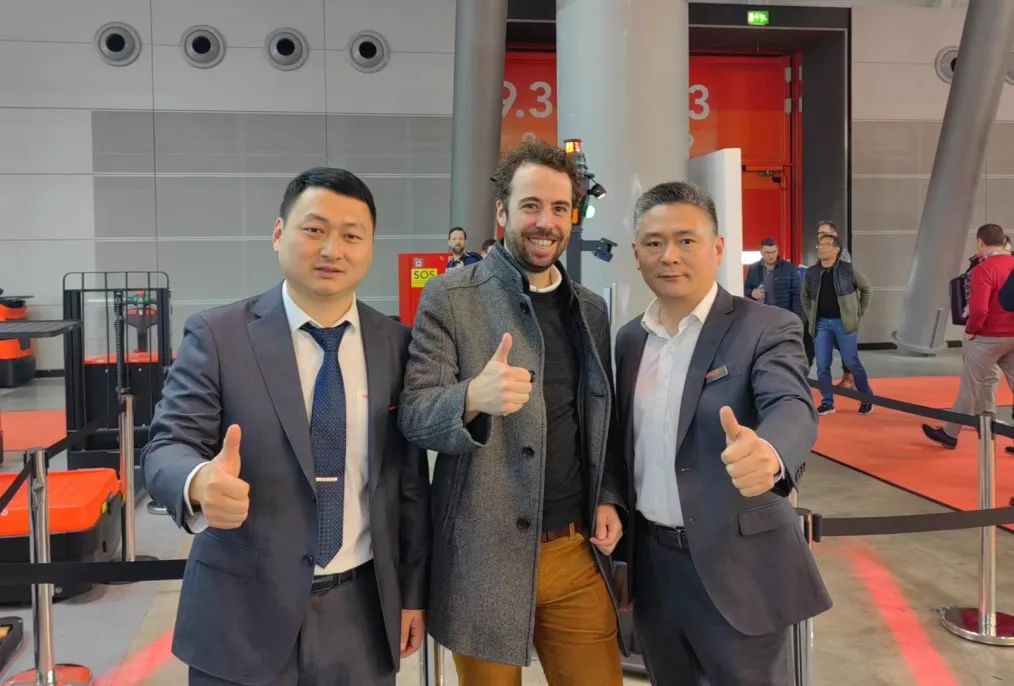 演讲结束后博世力士乐负责全球工业自动化业务的副总裁Thomas Fechner一行4人来到诺力展台,近距离观看了基于博世力士乐技术的移动机器人APT15的现场演示,并给予了高度评价。Thomas Fechner表示博世力士乐技术有助于节省AGV部署时间,并提供覆盖国际范围的技术支持,茆总表示诺力集团具备强大的工业车辆制造能力和全球业务扩展渠道。双方将共同致力于给客户带来更好用户体验,并携手开拓移动机器人的广阔市场。